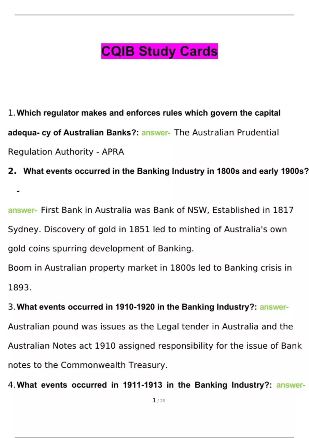 CQIB Study Cards Questions With Correct Answers. Which regulator makes and enforces rules which govern the capital adequacy of Australian Banks? - answerThe Australian Prudential Regulation Authority - APRA What events occurred in the Banking Industry in 1800s and early 1900s? - answerFirst Bank in Australia was Bank of NSW, Established in 1817 Sydney. Discovery of gold in 1851 led to minting of Australia's own gold coins spurring development of Banking. Boom in Australian property market in 1800s led to Banking crisis in 1893. What events occurred in in the Banking Industry? - answerAustralian pound was issues as the Legal tender in Australia and the Australian Notes act 1910 assigned responsibility for the issue of Bank notes to the Commonwealth Treasury. What events occurred in in the Banking Industry? - answerFederal government established the Commonwealth Bank, which by 1913 had branches in 6 states. What events occurred in 1920 in the Banking Industry? - answerCommonwealth performed some central Bank functions, which greatly expanded in World War II. What events occurred in in the Banking Industry? - answer1931 - The Great Depression, By the end Banking Industry became tightly regulated. Banks classified as either savings or trading Banks. What events occurred in in the Banking Industry? - answer14/01/1960 - Reserve Bank of Australia was created 1969 - Rolled out ATMs, and early 1970 BSB identifier was introduced. What events occurred in in the Banking Industry? - answerRenewed emphasis on corporate governance, values, ethics. Jan 17 - Better Banking program launched with initiatives: - Independent review of retail Banking remuneration and how we pay staff. - Getting problems fixed - Protecting whistle-blowers - Stopping poor conduct, and review of code of Banking practise What are other Finance service providers? Authorised Deposit-Taking Institutions (ADI's) - answerBuilding Societies: Credit Unions: What is a Building Society? - answerA mutual institution, which means that most people who have a savings account, or mortgage are members. Each building society and are responsible for setting its strategy. - Owner by and for the members - Limit on proportion of their funds that building societies can raise from wholesale money market - Reinvest surplus revenue into the business to provide new products and services. What is a credit union? - answera non-profit-making money cooperative whose members can borrow from pooled deposits at low interest rates. What are non-ADI's financial intermediaries? - answer- Money Markets Corporations - Finance Companies - Securitisation Vehicles What are the 4 types of financial markets - answer1. Primary Markets 2. Secondary Market 3. Exchange Traded Markets 4. Over the counter markets What is the Interest rate or Debt market. - answerTrading (Buying and Selling) includes shart term securities and long term securities such as government and corporate bonds. What is the Foreign Exchange Market? - answerExchanging one currency for another. Largest financial market in the World and 24 hours a day. Trading shared in listed companies - answerWhat is the equities market? What is the Commodities Market? - answerTrading in raw or primary products such as wheat, grain, cattle., or electricity. What is the Derivatives Market? - answerA contract whose value is derived from one or more underlining assets or instruments; for example, forward rate agreements or underlying exchange rates. What is microeconomics? - answerthe study of how households and firms make decisions and how they interact in markets. Supply and demand that impact the price levels in the economy. Taxes and Regulation created by governments. What is macroeconomics? - answerThe study of the economy as a whole - Unemployment rates - Gross Domestic Product - GDP - Inflation - Export and Imports What are the Australian Economy Facts and Figures - answer14th Largest economy measured by GDP 1.99 Trillon - 2019 - Australian Labour force 12.3 millions June 2020 - Low levels of inflation 2% July 2020 - Unemployment rate 7% What is Fiscal Policy? - answerGovernment spending and taxation that influences the economy. What is the Monetary Policy - answerRBA is responsible for Australians monetary policy - aims to protect price stability full employment and economic prosperity. What events occurred in 1980's in the Banking Industry? - answerGovernment adopted the four pillars policy. Announced it would reject any mergers between the Big 4 Banks. - NAB - CBA - Westpac - ANZ What is the role of the Bank? - answer1. Act as a financial intermediary between savers & borrowers. 2. Contributes to the development of the economy What is financial intermediation? - answerThe process of pooling funds from savers and using these funds to provide loans to borrowers. The Bank acts as a go between, or intermediary for those who have extra money and those who want to borrow. What are the 4 types of investment Banking? - answer1. Debt Capital Markets 2. Equity Capital Markets 3. Private Placements 4. Mergers and Acquisitions What is Debt Capital Markets? - answerWhere a large company may want to build a factory and is looking to issue bond financing to finance its expansion, or if a government wants to finance the building of an airport, highway, or other large municipal project, it may issue bonds to raise capital. What is Equity Capital Markets? - answerWhere a company needs more money to grow and decides to raise the funds by undertaking an initial public offering (IPO) whereby it sells its shares to the public and a wi