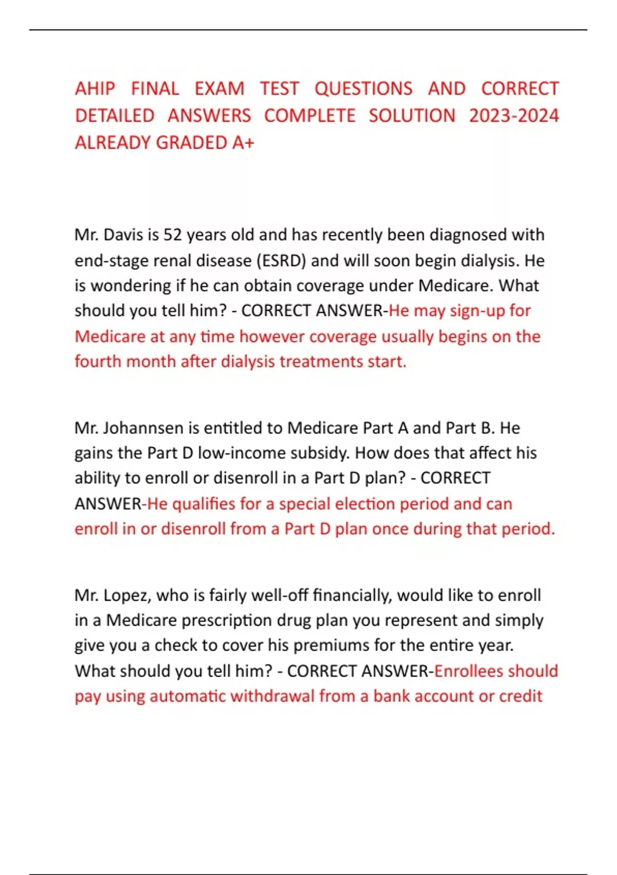 AHIP FINAL EXAM TEST QUESTIONS AND CORRECT DETAILED ANSWERS COMPLETE SOLUTION ALREADY GRADED A+ Mr. Davis is 52 years old and has recently been diagnosed with end-stage renal disease (ESRD) and will soon begin dialysis. He is wondering if he can obtain coverage under Medicare. What should you tell him? - CORRECT ANSWER-He may sign-up for Medicare at any time however coverage usually begins on the fourth month after dialysis treatments start. Mr. Johannsen is entitled to Medicare Part A and Part B. He gains the Part D low-income subsidy. How does that affect his ability to enroll or disenroll in a Part D plan? - CORRECT ANSWER-He qualifies for a special election period and can enroll in or disenroll from a Part D plan once during that period. Mr. Lopez, who is fairly well-off financially, would like to enroll in a Medicare prescription drug plan you represent and simply give you a check to cover his premiums for the entire year. What should you tell him? - CORRECT ANSWER-Enrollees should pay using automatic withdrawal from a bank account or credit or debit card, direct monthly billing from the plan, or deductions from their Social Security check. You have approached a hospital administrator about marketing in her facility. The administrator is uncomfortable with the suggestion. How could you address her concerns? - CORRECT ANSWER-Tell her that Medicare guidelines allow you to conduct marketing activities in common areas of a provider's facility. You have come to Mrs. Midler's home for a sales presentation. At the beginning of the presentation, Mrs. Midler tells you that she has a copy of her medical record available because she thinks this will help you understand her needs. She suggests that you will know which questions to ask her about her health status in order to best assist her in selecting a plan. What should you do? - CORRECT ANSWER-You can only ask Mrs. Midler questions about conditions that affect eligibility, specifically, whether she has end stage renal disease or one of the conditions that would qualify her for a special needs plan. Mrs. Reeves is newly eligible to enroll in a Medicare Advantage plan and her MA Initial Coverage Election Period (ICEP) has just begun. Which of the following can she not do during the ICEP? - CORRECT ANSWER-She can enroll in aAHIP FINAL EXAM TEST QUESTIONS AND CORRECT DETAILED ANSWERS COMPLETE SOLUTION ALREADY GRADED A+ Mr. Davis is 52 years old and has recently been diagnosed with end-stage renal disease (ESRD) and will soon begin dialysis. He is wondering if he can obtain coverage under Medicare. What should you tell him? - CORRECT ANSWER-He may sign-up for Medicare at any time however coverage usually begins on the fourth month after dialysis treatments start. Mr. Johannsen is entitled to Medicare Part A and Part B. He gains the Part D low-income subsidy. How does that affect his ability to enroll or disenroll in a Part D plan? - CORRECT ANSWER-He qualifies for a special election period and can enroll in or disenroll from a Part D plan once during that period. Mr. Lopez, who is fairly well-off financially, would like to enroll in a Medicare prescription drug plan you represent and simply give you a check to cover his premiums for the entire year. What should you tell him? - CORRECT ANSWER-Enrollees should pay using automatic withdrawal from a bank account or credit or debit card, direct monthly billing from the plan, or deductions from their Social Security check. You have approached a hospital administrator about marketing in her facility. The administrator is uncomfortable with the suggestion. How could you address her concerns? - CORRECT ANSWER-Tell her that Medicare guidelines allow you to conduct marketing activities in common areas of a provider's facility. You have come to Mrs. Midler's home for a sales presentation. At the beginning of the presentation, Mrs. Midler tells you that she has a copy of her medical record available because she thinks this will help you understand her needs. She suggests that you will know which questions to ask her about her health status in order to best assist her in selecting a plan. What should you do? - CORRECT ANSWER-You can only ask Mrs. Midler questions about conditions that affect eligibility, specifically, whether she has end stage renal disease or one of the conditions that would qualify her for a special needs plan. Mrs. Reeves is newly eligible to enroll in a Medicare Advantage plan and her MA Initial Coverage Election Period (ICEP) has just begun. Which of the following can she not do during the ICEP? - CORRECT ANSWER-She can enroll in aAHIP FINAL EXAM TEST QUESTIONS AND CORRECT DETAILED ANSWERS COMPLETE SOLUTION ALREADY GRADED A+ Mr. Davis is 52 years old and has recently been diagnosed with end-stage renal disease (ESRD) and will soon begin dialysis. He is wondering if he can obtain coverage under Medicare. What should you tell him? - CORRECT ANSWER-He may sign-up for Medicare at any time however coverage usually begins on the fourth month after dialysis treatments start. Mr. Johannsen is entitled to Medicare Part A and Part B. He gains the Part D low-income subsidy. How does that affect his ability to enroll or disenroll in a Part D plan? - CORRECT ANSWER-He qualifies for a special election period and can enroll in or disenroll from a Part D plan once during that period. Mr. Lopez, who is fairly well-off financially, would like to enroll in a Medicare prescription drug plan you represent and simply give you a check to cover his premiums for the entire year. What should you tell him? - CORRECT ANSWER-Enrollees should pay using automatic withdrawal from a bank account or credit or debit card, direct monthly billing from the plan, or deductions from their Social Security check. You have approached a hospital administrator about marketing in her facility. The administrator is uncomfortable with the suggestion. How could you address her concerns? - CORRECT ANSWER-Tell her that Medicare guidelines