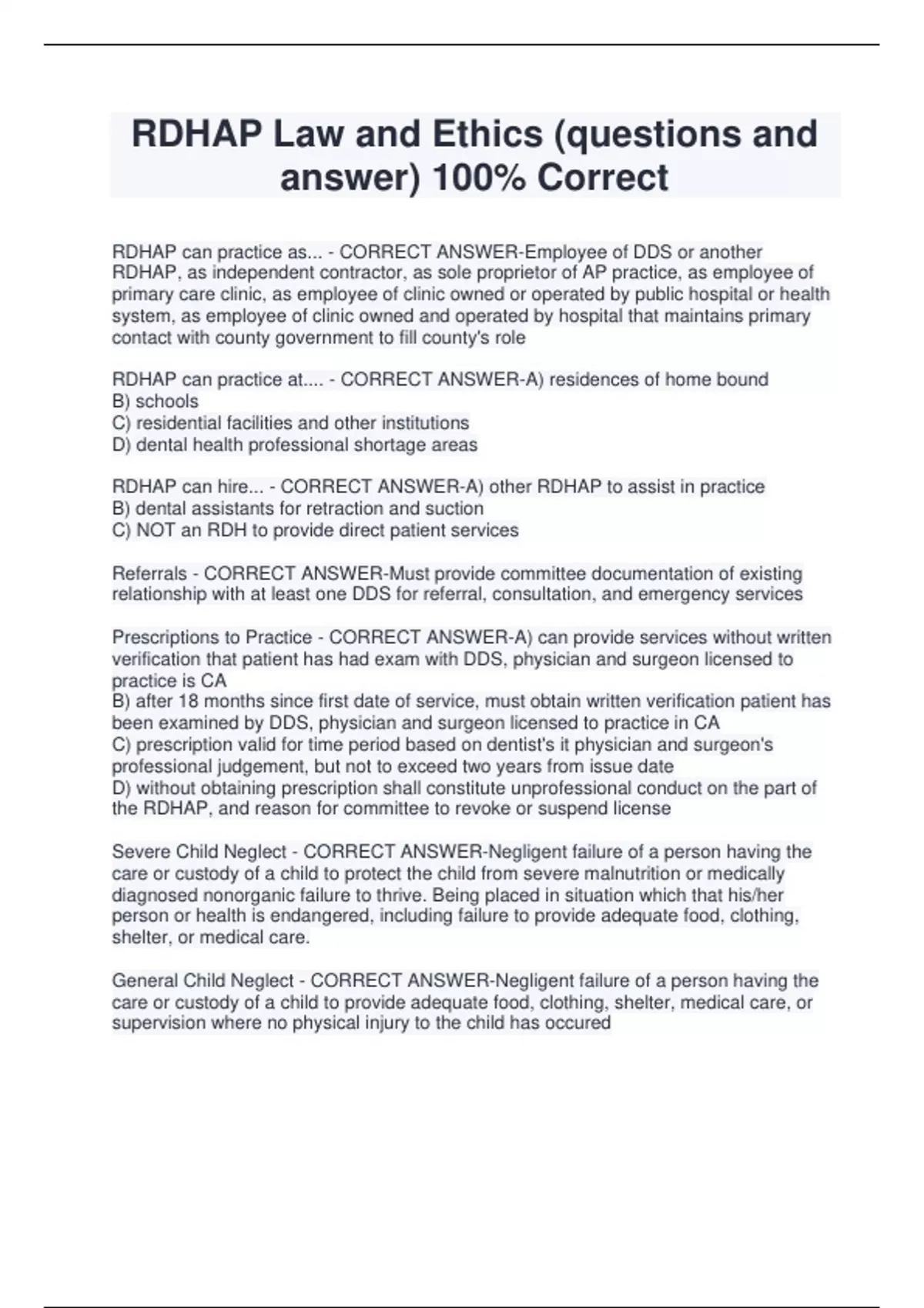 RDHAP Law and Ethics (questions and answer) 100% Correct RDHAP can practice as... - CORRECT ANSWER-Employee of DDS or another RDHAP, as independent contractor, as sole proprietor of AP practice, as employee of primary care clinic, as employee of clinic owned or operated by public hospital or health system, as employee of clinic owned and operated by hospital that maintains primary contact with county government to fill county's role RDHAP can practice at.... - CORRECT ANSWER-A) residences of home bound B) schools C) residential facilities and other institutions D) dental health professional shortage areas RDHAP can hire... - CORRECT ANSWER-A) other RDHAP to assist in practice B) dental assistants for retraction and suction C) NOT an RDH to provide direct patient services Referrals - CORRECT ANSWER-Must provide committee documentation of existing relationship with at least one DDS for referral, consultation, and emergency services Prescriptions to Practice - CORRECT ANSWER-A) can provide services without written verification that patient has had exam with DDS, physician and surgeon licensed to practice is CA B) after 18 months since first date of service, must obtain written verification patient has been examined by DDS, physician and surgeon licensed to practice in CA C) prescription valid for time period based on dentist's it physician and surgeon's professional judgement, but not to exceed two years from issue date D) without obtaining prescription shall constitute unprofessional conduct on the part of the RDHAP, and reason for committee to revoke or suspend license Severe Child Neglect - CORRECT ANSWER-Negligent failure of a person having the care or custody of a child to protect the child from severe malnutrition or medically diagnosed nonorganic failure to thrive. Being placed in situation which that his/her person or health is endangered, including failure to provide adequate food, clothing, shelter, or medical care. General Child Neglect - CORRECT ANSWER-Negligent failure of a person having the care or custody of a child to provide adequate food, clothing, shelter, medical care, or supervision where no physical injury to the child has occured Unlawful Corporal Punishment or Injury - CORRECT ANSWER-Situation where nay person willfully inflicts upon any child any cruel or inhuman corporal punishment or