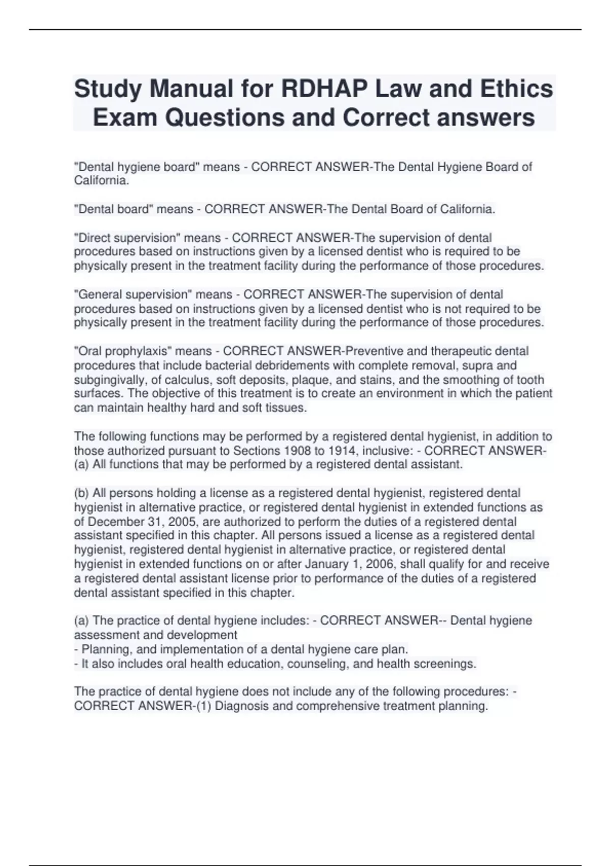 Study Manual for RDHAP Law and Ethics Exam Questions and Correct answers "Dental hygiene board" means - CORRECT ANSWER-The Dental Hygiene Board of California. "Dental board" means - CORRECT ANSWER-The Dental Board of California. "Direct supervision" means - CORRECT ANSWER-The supervision of dental procedures based on instructions given by a licensed dentist who is required to be physically present in the treatment facility during the performance of those procedures. "General supervision" means - CORRECT ANSWER-The supervision of dental procedures based on instructions given by a licensed dentist who is not required to be physically present in the treatment facility during the performance of those procedures. "Oral prophylaxis" means - CORRECT ANSWER-Preventive and therapeutic dental procedures that include bacterial debridements with complete removal, supra and subgingivally, of calculus, soft deposits, plaque, and stains, and the smoothing of tooth surfaces. The objective of this treatment is to create an environment in which the patient can maintain healthy hard and soft tissues. The following functions may be performed by a registered dental hygienist, in addition to those authorized pursuant to Sections 1908 to 1914, inclusive: - CORRECT ANSWER- (a) All functions that may be performed by a registered dental assistant. (b) All persons holding a license as a registered dental hygienist, registered dental hygienist in alternative practice, or registered dental hygienist in extended functions as of December 31, 2005, are authorized to perform the duties of a registered dental assistant specified in this chapter. All persons issued a license as a registered dental hygienist, registered dental hygienist in alternative practice, or registered dental hygienist in extended functions on or after January 1, 2006, shall qualify for and receive a registered dental assistant license prior to performance of the duties of a registered dental assistant specified in this chapter. (a) The practice of dental hygiene includes: - CORRECT ANSWER-- Dental hygiene assessment and development - Planning, and implementation of a dental hygiene care plan. - It also includes oral health education, counseling, and health screenings. The practice of dental hygiene does not include any of the following procedures: - CORRECT ANSWER-(1) Diagnosis and comprehensive treatment planning. (2) Placing, condensing, carving, or removal of permanent restorations. (3) Surgery or cutting on hard and soft tissue including, but not limited to, the removal of teeth and the cutting and suturing of soft tissue. (4) Prescribing medication. (5) Administering local or general anesthesia or oral or parenteral conscious sedation, except for the administration of nitrous oxide and oxygen, whether administered alone or in combination with each other, or local anesthesia pursuant to Section 1909. A registered dental hygienist is authorized to perform the following procedures under direct supervision of a licensed dentist, after submitting to the dental hygiene board evidence of satisfactory completion of a course of instruction, approved by the dental hygiene board, in the procedures: - CORRECT ANSWER-(a) Soft-tissue curettage. (b) Administration of local anesthesia. (c) Administration of nitrous oxide and oxygen, whether administered alone or in combination with each other. A registered dental hygienist is authorized to perform the following procedures under general supervision: - CORRECT ANSWER-(a) Preventive and therapeutic interventions, including oral prophylaxis, scaling, and root planing. (b) Application of topical, therapeutic, and subgingival agents used for the control of caries and periodontal disease. (c) The taking of impressions for bleaching trays and application and activation of agents with nonlaser, light-curing devices. (d) The taking of impressions for bleaching trays and placements of in-office, toothwhitening devices. (a) A registered dental hygienist may provide, without supervision: - CORRECT ANSWER-Educational services, oral health training programs, and oral health screenings. A registered dental hygienist shall refer any screened patients with possible oral abnormalities to a dentist for: - CORRECT ANSWER-a comprehensive examination, diagnosis, and treatment plan. In any public health program created by federal, state, or local law or administered by a federal, state, county, or local governmental entity, at a sponsored event by a sponsoring entity or at a nonprofit organization, a registered dental hygienist may provide, without supervision: - CORRECT ANSWER-Dental hygiene preventive services