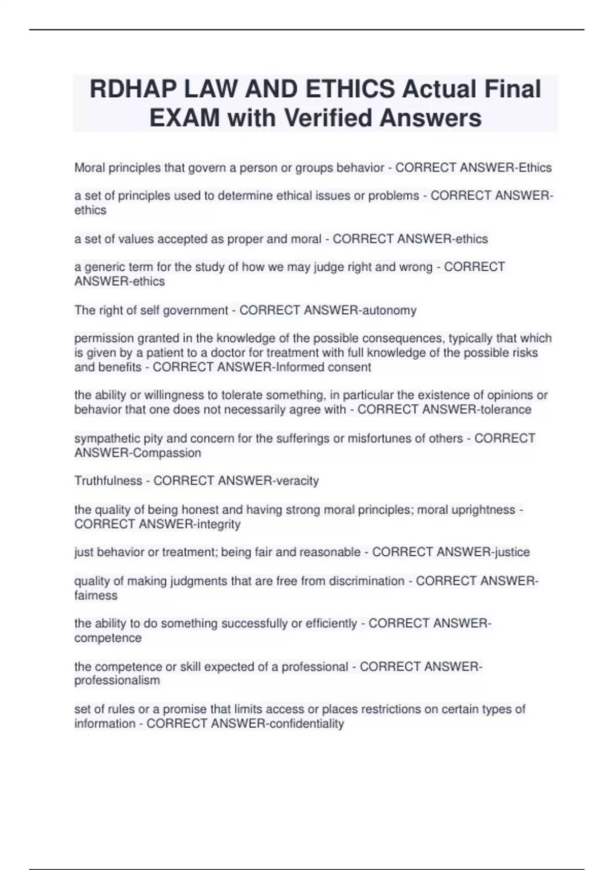 RDHAP LAW AND ETHICS Actual Final EXAM with Verified Answers Moral principles that govern a person or groups behavior - CORRECT ANSWER-Ethics a set of principles used to determine ethical issues or problems - CORRECT ANSWERethics a set of values accepted as proper and moral - CORRECT ANSWER-ethics a generic term for the study of how we may judge right and wrong - CORRECT ANSWER-ethics The right of self government - CORRECT ANSWER-autonomy permission granted in the knowledge of the possible consequences, typically that which is given by a patient to a doctor for treatment with full knowledge of the possible risks and benefits - CORRECT ANSWER-Informed consent the ability or willingness to tolerate something, in particular the existence of opinions or behavior that one does not necessarily agree with - CORRECT ANSWER-tolerance sympathetic pity and concern for the sufferings or misfortunes of others - CORRECT ANSWER-Compassion Truthfulness - CORRECT ANSWER-veracity the quality of being honest and having strong moral principles; moral uprightness - CORRECT ANSWER-integrity just behavior or treatment; being fair and reasonable - CORRECT ANSWER-justice quality of making judgments that are free from discrimination - CORRECT ANSWERfairness the ability to do something successfully or efficiently - CORRECT ANSWERcompetence the competence or skill expected of a professional - CORRECT ANSWERprofessionalism set of rules or a promise that limits access or places restrictions on certain types of information - CORRECT ANSWER-confidentiality