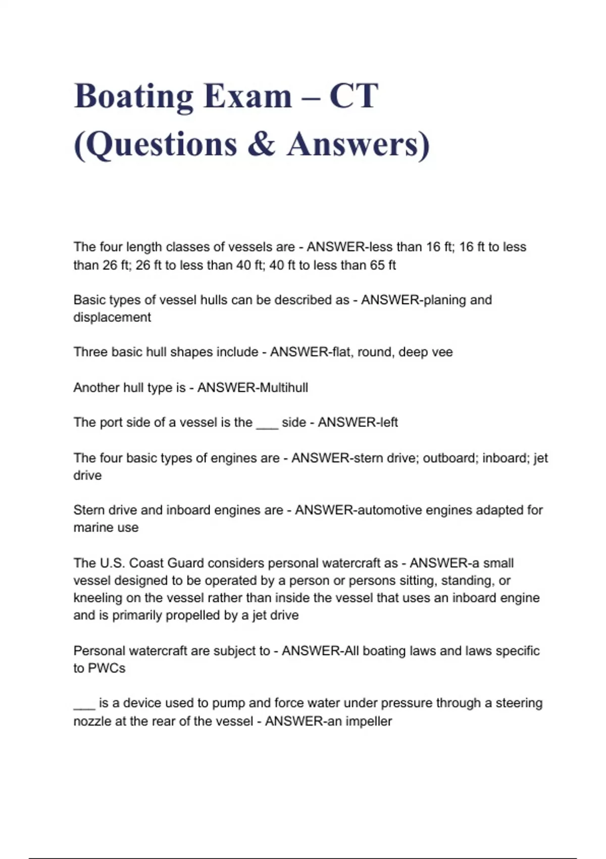 Boating Exam – CT (Questions & Answers) with complete solution