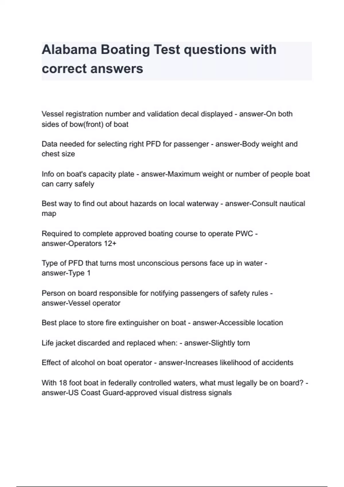 Alabama Boating Test questions with correct answers with complete solution