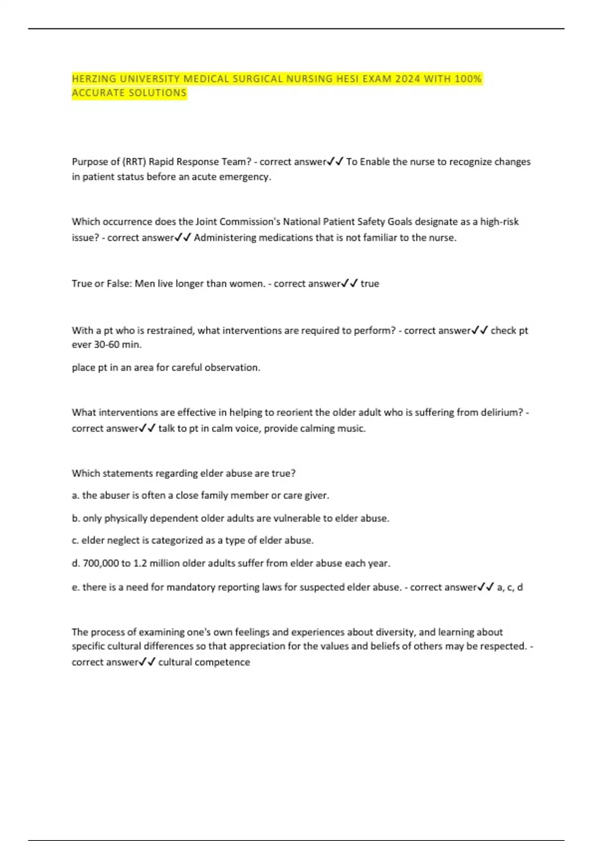HERZING UNIVERSITY MEDICAL SURGICAL NURSING HESI EXAM 2024 WITH 100% ACCURATE SOLUTIONS Purpose of (RRT) Rapid Response Team? - correct answer To Enable the nurse to recognize changes in patient status before an acute emergency. Which occurrence does the Joint Commission's National Patient Safety Goals designate as a high-risk issue? - correct answer Administering medications that is not familiar to the nurse. True or False: Men live longer than women. - correct answer true With a pt who is restrained, what interventions are required to perform? - correct answer check pt ever 30-60 min. place pt in an area for careful observation. What interventions are effective in helping to reorient the older adult who is suffering from delirium? - correct answer talk to pt in calm voice, provide calming music. Which statements regarding elder abuse are true? a. the abuser is often a close family member or care giver. b. only physically dependent older adults are vulnerable to elder abuse. c. elder neglect is categorized as a type of elder abuse. d. 70