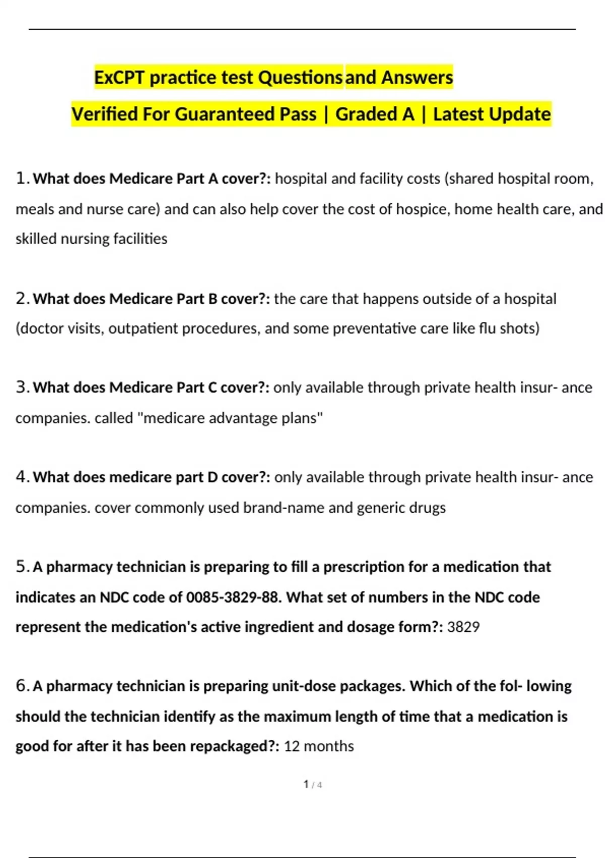 ExCPT Review 2024 Questions and Answers Verified For Guaranteed Pass | Graded A | Latest Update ExCPT Review 2024 Questions and Answers Verified For Guaranteed Pass | Graded A | Latest Update ExCPT Review 2024 Questions and Answers Verified For Guaranteed Pass | Graded A | Latest Update ExCPT Review 2024 Questions and Answers Verified For Guaranteed Pass | Graded A | Latest Update ExCPT Review Questions and Answers Verified For Guaranteed Pass | Graded A | Latest Update 1. A pharmacy technician should identify that which of the following supplies is typically used in a compounding pharmacy to crush tablets: mortar and pestle 2. A pharmacy technician should identify that which of the following medica- tions reduces cholesterol?: Atorvastatin (Lipitor) 3. A pharmacy technician should identify that which of the following environ- ments should be used to compound a sterile IV preparation?: ISO 5 4. A pharmacy technician should identify that which of the following is another name for Vitamin B12?: Cyanocobalamin 5. A pharmacy technician should identify that medications requiring refriger- ation should be stored within which of the following temperature ranges: 36 - 46 F 6. According to the federal Combat Methamphetamine Epidemic Act of 2005, a pharmacy technician should identify that which of the following is the maximum amount of pseudoephedrine (Sudafed) that a patient can obtain in 1 day?: 3.6 g 7. A pharmacy technician should identify that which of the following types of active listening involves asking the patient clarifying questions regarding what the technician heard that patient say?: Evaluating 8. A pharmacy technician has received an emergency prescription by for for a schedule II medication. According to federal law, the prescriber must issue a written, signed prescription within how many days?: 7 days 9. A pharmacy technician should identify that which of the following abbreva- tions means "left ear?": as 10. A pharmacy technician should mark medications that are set to expire how many months before the listed expiration date?: 6 months 11. A pharmacy technician should identify that which of the following con- trolled substance schedules includes anabolic steroids?: Schedule III 12. According to UPS <797>, which of the following locations should the pharmacy technician use to gown, gather materials, and label medications for IV preparations?: Anteroom 13. A pharmacy technician should identify that which of the following is the primary goal of the Risk Evaluation and Mitigation Strategy (REMS) program?- : To inform patients of the risks associated with a medication
