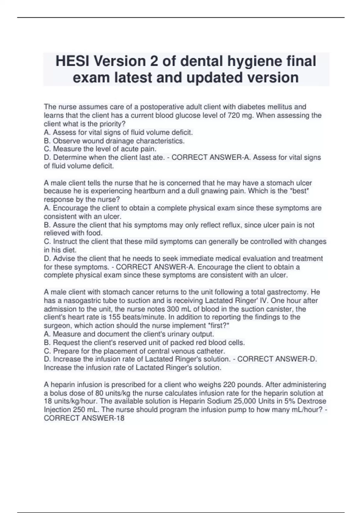 HESI Version 2 of dental hygiene final exam latest and updated version The nurse assumes care of a postoperative adult client with diabetes mellitus and learns that the client has a current blood glucose level of 720 mg. When assessing the client what is the priority? A. Assess for vital signs of fluid volume deficit. B. Observe wound drainage characteristics. C. Measure the level of acute pain. D. Determine when the client last ate. - CORRECT ANSWER-A. Assess for vital signs of fluid volume deficit. A male client tells the nurse that he is concerned that he may have a stomach ulcer because he is experiencing heartburn and a dull gnawing pain. Which is the *best* response by the nurse? A. Encourage the client to obtain a complete physical exam since these symptoms are consistent with an ulcer. B. Assure the client that his symptoms may only reflect reflux, since ulcer pain is not relieved with food. C. Instruct the client that these mild symptoms can generally be controlled with changes in his diet. D. Advise the client that he needs to seek immediate medical evaluation and treatment for these symptoms. - CORRECT ANSWER-A. Encourage the client to obtain a complete physical exam since these symptoms are consistent with an ulcer. A male client with stomach cancer returns to the unit following a total gastrectomy. He has a nasogastric tube to suction and is receiving Lactated Ringer' IV. One hour after admission to the unit, the nurse notes 300 mL of blood in the suction canister, the client's heart rate is 155 beats/minute. In addition to reporting the findings to the surgeon, which action should the nurse implement *first?* A. Measure and document the client's urinary output. B. Request the client's reserved unit of packed red blood cells. C. Prepare for the placement of central venous catheter. D. Increase the infusion rate of Lactated Ringer's solution. - CORRECT ANSWER-D. Increase the infusion rate of Lactated Ringer's solution. A heparin infusion is prescribed for a client who weighs 220 pounds. After administering a bolus dose of 80 units/kg the nurse calculates infusion rate for the heparin solution at 18 units/kg/hour. The available solution is Heparin Sodium 25,000 Units in 5% Dextrose Injection 250 mL. The nurse should program the infusion pump to how many mL/hour? - CORRECT ANSWER-18 An adult male who fell 20 feet from the roof of his home has multiple injuries, including a right pneumothorax. Chest tubes were inserted in the emergency department prior to his transfer to the intensive care unit (ICU). The nurse notes that the suction control chamber is bubbling at the -10 cm H2O mark with fluctuation in the water seal, and over the past hour 75 mL of bright red blood is measured in the collection chamber. Which intervention should the nurse implement? A. Add sterile water to the suction control chamber B. Give blood from the collection chamber as autotransfusion C. Manipulate blood in tubing to drain into the chamber D. Increase wall suction to eliminate fluctuation in water seal - CORRECT ANSWER-A. Add sterile water to the suction control chamber. An adult male was diagnosed with stage IV lung cancer three weeks ago. His wife approaches the nurse and asks how she will know that her husband's death is imminent because their two adult children want to be there when he dies. Which is the *best* response by the nurse? A. Gather information regarding how long it will take for the children to arrive B. Explain that the client will start to lose consciousness and the body systems will slow down. C. Reassure the spouse that the healthcare provider will notify when to call the children. D. Offer to discuss the client's health status with each of the adult children. - CORRECT ANSWER-B. Explain that the client will start to lose consciousness and the body systems will slow down. The charge nurse of a critical carry unit is informed at the beginning of the shift that lesss than the optical number of registered nurses will be working that shift and planning assignments which client should receive the most care hours by registered nurse (RN)? A. 48 year olds marathon runner with a central venous catheter who is experiencing nausea and vomiting due to electrolyte disturbance following a race B. 34 year old admitted today after an emergency appendectomy who has a peripheral intravenous catheter and a Foley catheter C. 63-year-old chain smoker admitted with chronic bronchitis who is receiving oxygen via nasal cannula and has a saline-locked peripheral intravenous catheter D. An 82-year-old's client with Alzheimer's disease and newly fractured femur who has a Foley catheter and soft wrist restraint supplied - CORRECT ANSWER-D. An 82-yearold's client with Alzheimer's disease and newly fractured femur who has a Foley catheter and soft wrist restraint supplied The nurse is preparing a dose of 60 mcg of teriparatide. The medication is labeled "750 mg/2.4 mL." How many mL should the nurse administer? - CORRECT ANSWER-0.2 In caring for a client with Cushing's syndrome which serum laboratory value is most important for the nurse to monitor? A. Creatinine B. Lactate C. Glucose D. Hemoglobin - CORRECT ANSWER-C. Glucose A client who received hemodialysis yesterday is experiencing a blood pressure of 200/100 mmHg, heart rate 110 beats/minute, and respiratory rate 36 breaths/minute. The client is manifesting shortness of b