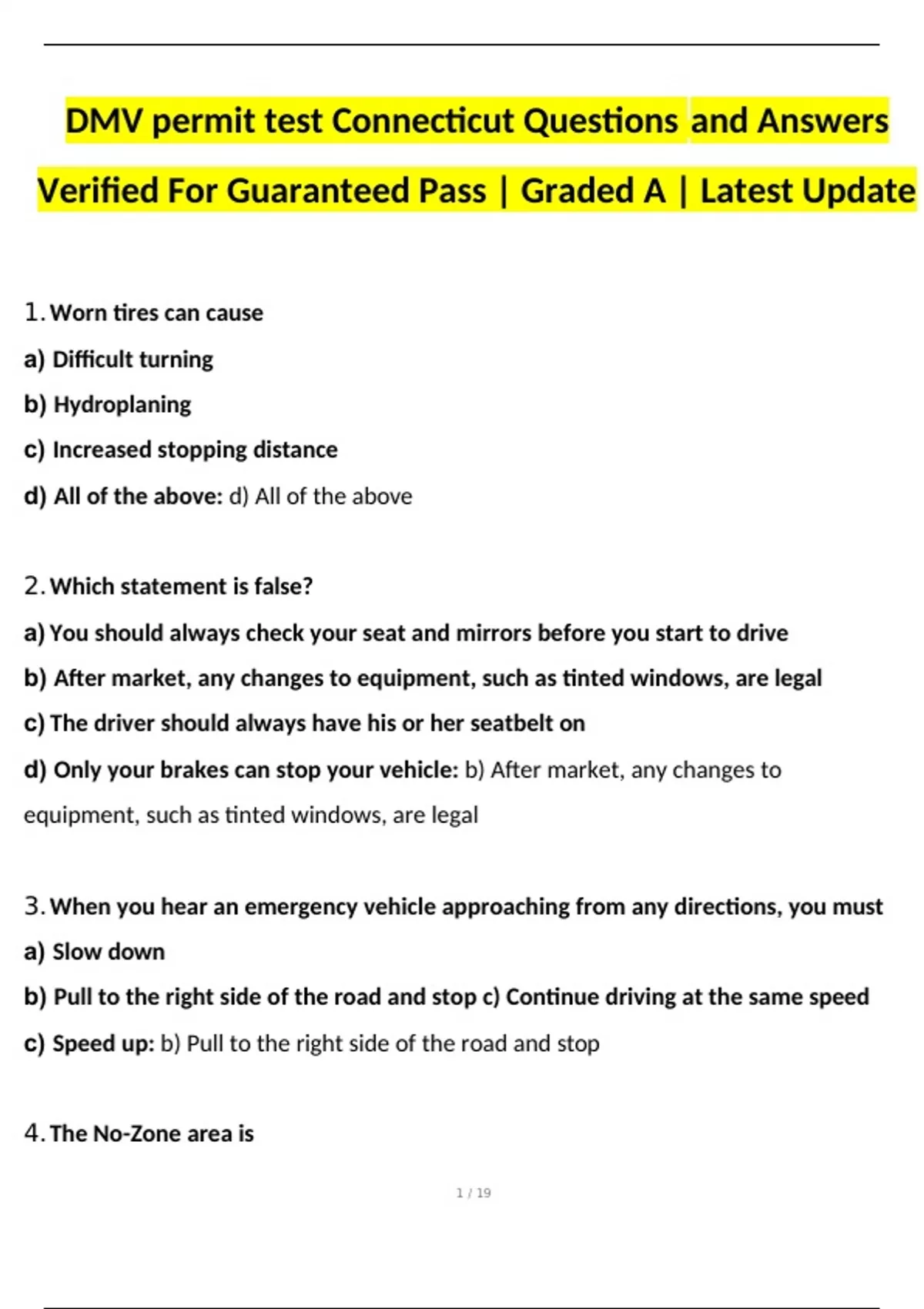 DMV permit test Connecticut 2024 Questions and Answers Verified For Guaranteed Pass | Graded A | Latest Update DMV permit test Connecticut 2024 Questions and Answers Verified For Guaranteed Pass | Graded A | Latest Update DMV permit test Connecticut 2024 Questions and Answers Verified For Guaranteed Pass | Graded A | Latest Update DMV permit test Connecticut Questions and Answers Verified For Guaranteed Pass | Graded A | Latest Update 1. Worn tires can cause a) Difficult turning b) Hydroplaning c) Increased stopping distance d) All of the above: d) All of the above 2. Which statement is false? a) You should always check your seat and mirrors before you start to drive b) After market, any changes to equipment, such as tinted windows, are legal c) The driver should always have his or her seatbelt on d) Only your brakes can stop your vehicle: b) After market, any changes to equipment, such as tinted windows, are legal 3. When you hear an emergency vehicle approaching from any directions, you must a) Slow down b) Pull to the right side of the road and stop c) Continue driving at the same speed c) Speed up: b) Pull to the right side of the road and stop 4. The No-Zone area is a) An area where pedestrians cannot cross the street b) An area where vehicles are not allowed to park c) The danger areas around a truck where there are blind spots for the driver d) None of the above: c) The danger areas around a truck where there are blind spots for the driver 5. At a four way stop a) The vehicle on the left goes first b) You do not have to stop if there are no other vehicles around c) The vehicle on the right goes first c) School buses go first: c) The vehicle on the right goes first 6. When you change lanes you should a) Look over your shoulder in the direction you plan to move b) Blow your horn before changing lanes c) Cross two or more lanes at one time d) Flash your headlights: a) Look over your shoulder in the direction you plan to move 7. If an approaching vehicle fails to dim their headlights, you should a) Look to the center of the road b) Flash your headlights quickly a couple of times c) Keep your bright lights on d) Turn your headlights off: b) Flash your headlights quickly a couple of times