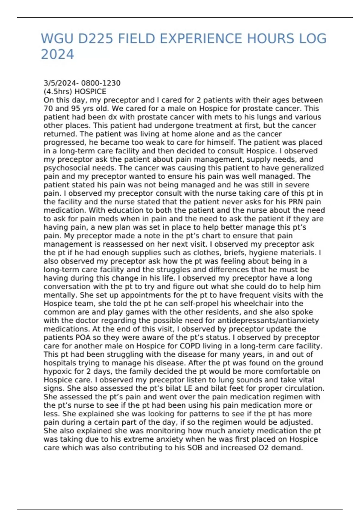 WGU D225 FIELD EXPERIENCE HOURS LOG 2024 3/5/ (4.5hrs) HOSPICE On this day, my preceptor and I cared for 2 patients with their ages between 70 and 95 yrs old. We cared for a male on Hospice for prostate cancer. This patient had been dx with prostate cancer with mets to his lungs and various other places. This patient had undergone treatment at first, but the cancer returned. The patient was living at home alone and as the cancer progressed, he became too weak to care for himself. The patient was placed in a long-term care facility and then decided to consult Hospice. I observed my preceptor ask the patient about pain management, supply needs, and psychosocial needs. The cancer was causing this patient to have generalized pain and my preceptor wanted to ensure his pain was well managed. The patient stated his pain was not being managed and he was still in severe pain. I observed my preceptor consult with the nurse taking care of this pt in the facility and the nurse stated that the patient never asks for his PRN pain medication. With education to both the patient and the nurse about the need to ask for pain meds when in pain and the need to ask the patient if they are having pain, a new plan was set in place to help better manage this pt’s pain. My preceptor made a note in the pt’s chart to ensure that pain management ................................. Download t0 view full document