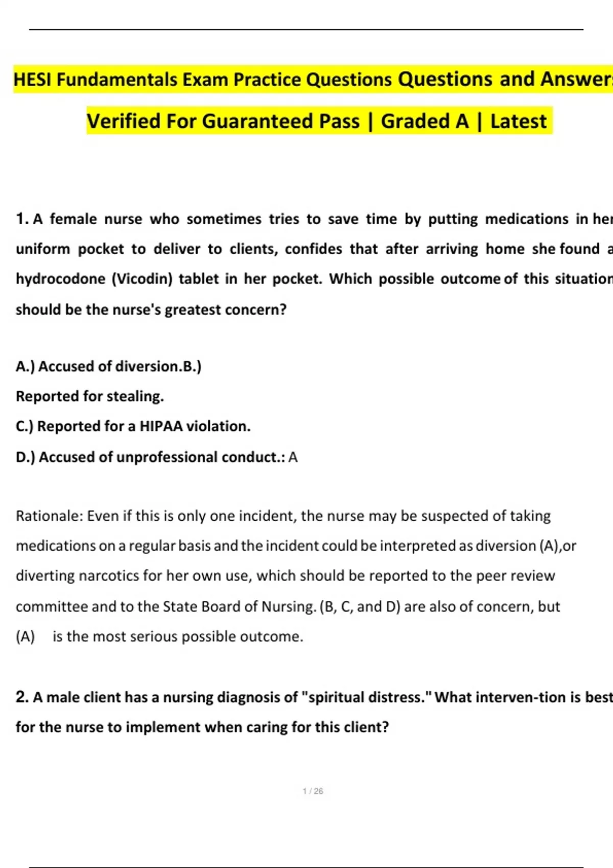 HESI Fundamentals Exam Practice 2024 Questions and Answers Verified For Guaranteed Pass | Graded A | Latest HESI Fundamentals Exam Practice 2024 Questions and Answers Verified For Guaranteed Pass | Graded A | Latest HESI Fundamentals Exam Practice 2024 Questions and Answers Verified For Guaranteed Pass | Graded A | Latest HESI Fundamentals Exam Practice Questions and Answers Verified For Guaranteed Pass | Graded A | Latest 1. A female nurse who sometimes tries to save time by putting medications in her uniform pocket to deliver to clients, confides that after arriving home she found a hydrocodone (Vicodin) tablet in her pocket. Which possible outcome of this situation should be the nurse's greatest concern? A.) Accused of diversion. B.) Reported for stealing. C.) Reported for a HIPAA violation. D.) Accused of unprofessional conduct.: A Rationale: Even if this is only one incident, the nurse may be suspected of taking medications on a regular basis and the incident could be interpreted as diversion (A), or diverting narcotics for her own use, which should be reported to the peer review committee and to the State Board of Nursing. (B, C, and D) are also of concern, but (A) is the most serious possible outcome. 2. A male client has a nursing diagnosis of "spiritual distress." What interven- tion is best for the nurse to implement when caring for this client? A.) Use distraction techniques during times of spiritual stress and crisis. B.) Reassure the client that his faith will be regained with time and support. C.) Consult with the staff chaplain and ask that the chaplain visit with the client. D.) Use reflective listening techniques when the client expresses spiritual doubts.: D Rationale: The most beneficial nursing intervention is to use nonjudgmental re- flective listening techniques, to allow the client to feel comfortable expressing his concerns (D). (A and B) are not therapeutic. The client should be consulted before implementing (C). 3. The nurse removes the dressing on a client's heel that is covering a pres- sure sore one-inch in diameter and finds that there is straw-colored drainage seeping from the wound. What description of this finding should the nurse include in the client's record? A.) Stage 1 pressure sore draining sero-sanguineous drainage. B.) Pressure sore at bony prominence with exudate noted. C.) One-inch pressure sore draining serous fluid. D.) Pressure sore on heel with a small amount of purulent drainage.: C Rationale: Serous drainage is clear watery plasma, so (C) provides accurate doc- umentation based on the information provided. Information to stage this pressure score (A) is not provided, and sero-sanguineous drainage is pale and watery with a combination of plasma and red cells, and may be blood-streaked. Exudate (B) is fluid such as pus and serum. Purulent drainage (D) is thick, yellow, green, or brown indicating the presence of dead or living organisms and white blood cells.