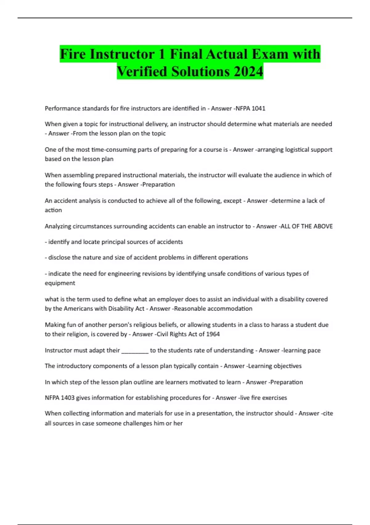 Fire Instructor 1 Final Actual Exam with Verified Solutions 2024 Performance standards for fire instructors are identified in - Answer -NFPA 1041 When given a topic for instructional delivery, an instructor should determine what materials are needed - Answer -From the lesson plan on the topic One of the most time-consuming parts of preparing for a course is - Answer -arranging logistical support based on the lesson plan When assembling prepared instructional materials, the instructor will evaluate the audience in which of the following fours steps - Answer -Preparation An accident analysis is conducted to achieve all of the following, except - Answer -determine a lack of action Analyzing circumstances surrounding accidents can enable an instructor to - Answer -ALL OF THE ABOVE - identify and locate principal sources of accidents - disclose the nature and size of accident problems in different operations - indicate the need for engineering revisions by identifying unsafe conditions of various types of equipment what is the term used to define what an employer does to assist an individual with a disability covered by the Americans with Disability Act - Answer -Reasonable accommodation Making fun of another person's religious beliefs, or allowing students in a class to harass a student due to their religion, is covered by - Answer -Civil Rights Act of 1964 Instructor must adapt their ________ to the students rate of understanding - Answer -learning pace The introductory components of a lesson plan typically contain - Answer -Learning objectives In which step of the lesson plan outline are learners motivated to learn - Answer -Preparation NFPA 1403 gives information for establishing procedures for - Answer -live fire exercises When collecting information and materials for use in a presentation, the instructor should - Answer -cite all sources in case someone challenges him or herAn important part of a lesson plan that indicates for whom the lesson plan was developed is the - Answer -level of instruction The purpose of the presentation step of the instructional process is to - Answer -Present new skills and concepts Directions: Read the following statements regarding instructors, then select your answer - Answer - INSTRUCTORS LEAD OR GUIDE LEARNERS THROUGH A CLASS INSTRUCTORS MUST HAVE A DESIRE TO UNDERSTAND THE NEEDS OF LEARNERS which of the flowing statements IS NOT TRUE regarding the functions of a lesson plan - Answer -they are a rigid procedure that must be followed for successful teaching The law of _____ states that no one will ever become proficient at any skill without performing the operation - Answer -Exercise Which of the following is a good seating arrangement when instruction a class composed of a small discussion group - Answer -Hollow square or round table An instructor must be prepared for unanticipated situations, including - Answer -INCLEMENT WEATHER LEARNING STYLE DIFFERENCE EQUIPMENT VARIATON - ALL OF THE ABOVE A method of instruction used when students act out situations in known as - Answer -Role playing The method of instruction to use when you want learners to gain practical experience without "real-life" risks - Answer -Simulation The greatest common concern in the outdoor classroom environment is - Answer -Safety Which of the following IS NOT part of the evaluation step of the instructional process - Answer - Explaining Procedures Factors that prevent a receiver from fully receiving a message, created by either internal or external sources are called - Answer -Interference/Environment It is the responsibility of a fire service instructor to plan teaching methods so that ideas are conveyed to the learner - Answer -through as many of the senses as is practical At the beginning of a presentation, the instructor should clearly state - Answer -the objectives of the lesson