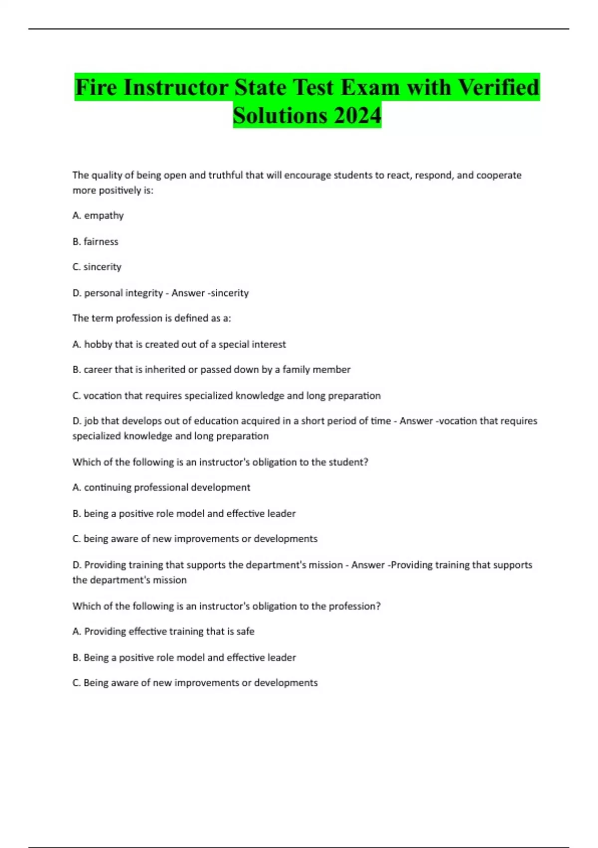 Fire Instructor State Test Exam with Verified Solutions 2024 The quality of being open and truthful that will encourage students to react, respond, and cooperate more positively is: A. empathy B. fairness C. sincerity D. personal integrity - Answer -sincerity The term profession is defined as a: A. hobby that is created out of a special interest B. career that is inherited or passed down by a family member C. vocation that requires specialized knowledge and long preparation D. job that develops out of education acquired in a short period of time - Answer -vocation that requires specialized knowledge and long preparation Which of the following is an instructor's obligation to the student? A. continuing professional development B. being a positive role model and effective leader C. being aware of new improvements or developments D. Providing training that supports the department's mission - Answer -Providing training that supports the department's mission Which of the following is an instructor's obligation to the profession? A. Providing effective training that is safe B. Being a positive role model and effective leader C. Being aware of new improvements or developmentsD. Providing training that supports the department's mission - Answer -Being a positive role model and effective leader Which of the following is an instructor's obligation to themselves? A. continuing professional development B. being a positive role model and effective leader C. being aware of new improvements or developments D. providing training that supports the department's mission - Answer -being aware of new improvements or developments Which challenge requires instructor awareness of time constraints and other outside influences on students' ability to train? A. student diversity B. student priorities C. instructor priorities D. organizational apathy - Answer -student pri