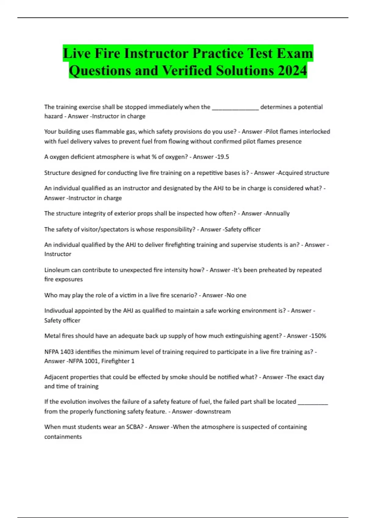 Live Fire Instructor Practice Test Exam Questions and Verified Solutions 2024 The training exercise shall be stopped immediately when the ______________ determines a potential hazard - Answer -Instructor in charge Your building uses flammable gas, which safety provisions do you use? - Answer -Pilot flames interlocked with fuel delivery valves to prevent fuel from flowing without confirmed pilot flames presence A oxygen deficient atmosphere is what % of oxygen? - Answer -19.5 Structure designed for conducting live fire training on a repetitive bases is? - Answer -Acquired structure An individual qualified as an instructor and designated by the AHJ to be in charge is considered what? - Answer -Instructor in charge The structure integrity of exterior props shall be inspected how often? - Answer -Annually The safety of visitor/spectators is whose responsibility? - Answer -Safety officer An individual qualified by the AHJ to deliver firefighting training and supervise students is an? - Answer - Instructor Linoleum can contribute to unexpected fire intensity how? - Answer -It's been preheated by repeated fire exposures Who may play the role of a victim in a live fire scenario? - Answer -No one Indivudual appointed by the AHJ as qualified to maintain a safe working environment is? - Answer - Safety officer Metal fires should have an adequate back up supply of how much extinguishing agent? - Answer -150% NFPA 1403 identifies the minimum level of training required to participate in a live fire training as? - Answer -NFPA 1001, Firefighter 1 Adjacent properties that could be effected by smoke should be notified what? - Answer -The exact day and time of training If the evolution involves the failure of a safety feature of fuel, the f