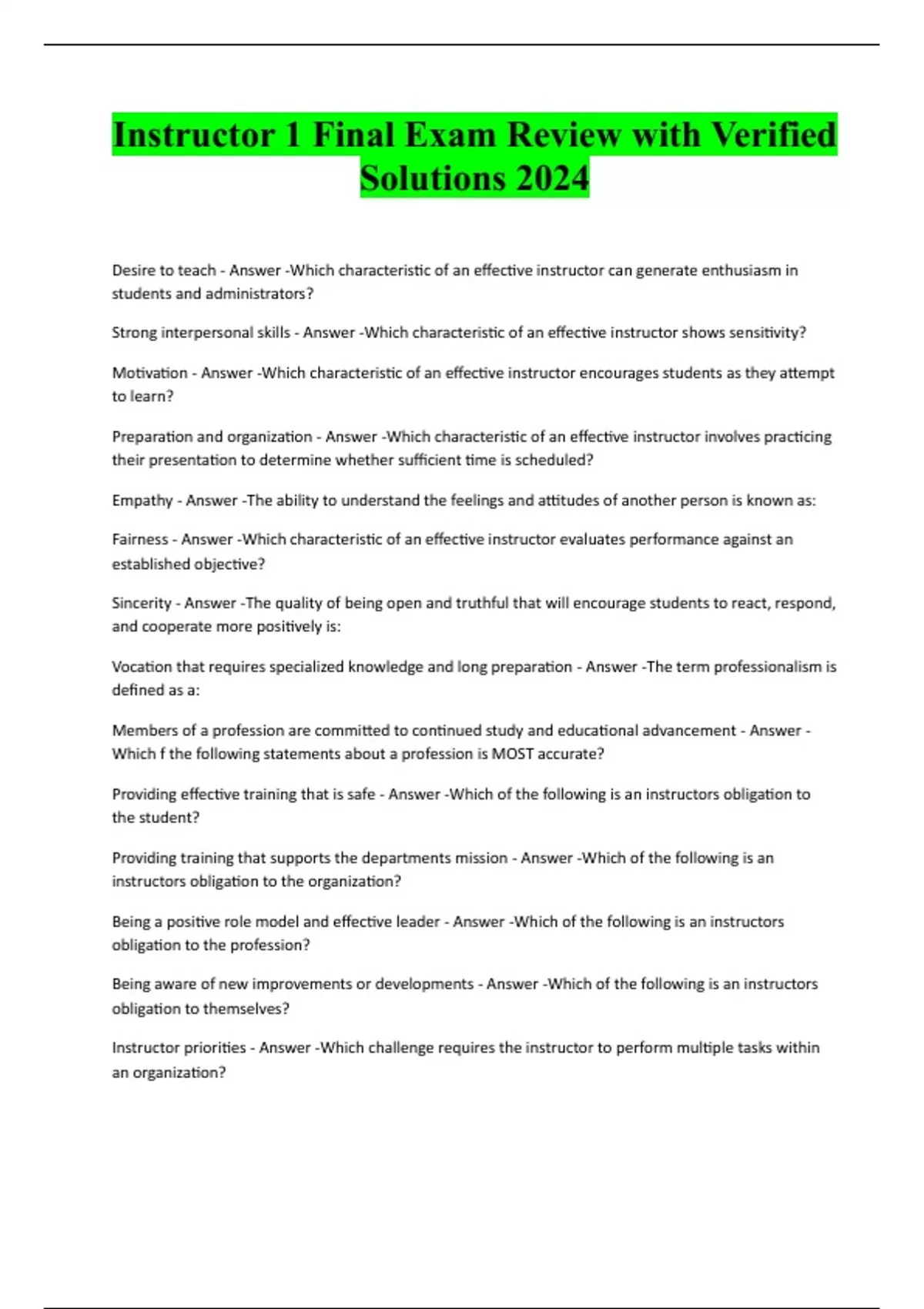 Instructor 1 Final Exam Review with Verified Solutions 2024 Desire to teach - Answer -Which characteristic of an effective instructor can generate enthusiasm in students and administrators? Strong interpersonal skills - Answer -Which characteristic of an effective instructor shows sensitivity? Motivation - Answer -Which characteristic of an effective instructor encourages students as they attempt to learn? Preparation and organization - Answer -Which characteristic of an effective instructor involves practicing their presentation to determine whether sufficient time is scheduled? Empathy - Answer -The ability to understand the feelings and attitudes of another person is known as: Fairness - Answer -Which characteristic of an effective instructor evaluates performance against an established objective? Sincerity - Answer -The quality of being open and truthful that will encourage students to react, respond, and cooperate more positively is: Vocation that requires specialized knowledge and long preparation - Answer -The term professionalism is defined as a: Members of a profession are committed to continued study and educational advancement - Answer - Which f the following statements about a profession is MOST accurate? Providing effective training that is safe - Answer -Which of the following is an instructors obligation to the student? Providing training that supports the departments mission - Answer -Which of the following is an instructors obligation to the organization? Being a positive role model and effective leader - Answer -Which of the following is an instructors obligation to the profession? Being aware of new improvements or developments - Answer -Which of the following is an instructors obligation to themselves? Instructor priorities - Answer -Which challenge requires the instructor to perform multiple tasks within an organization?Student Priorities - Answer -Which challenge requires