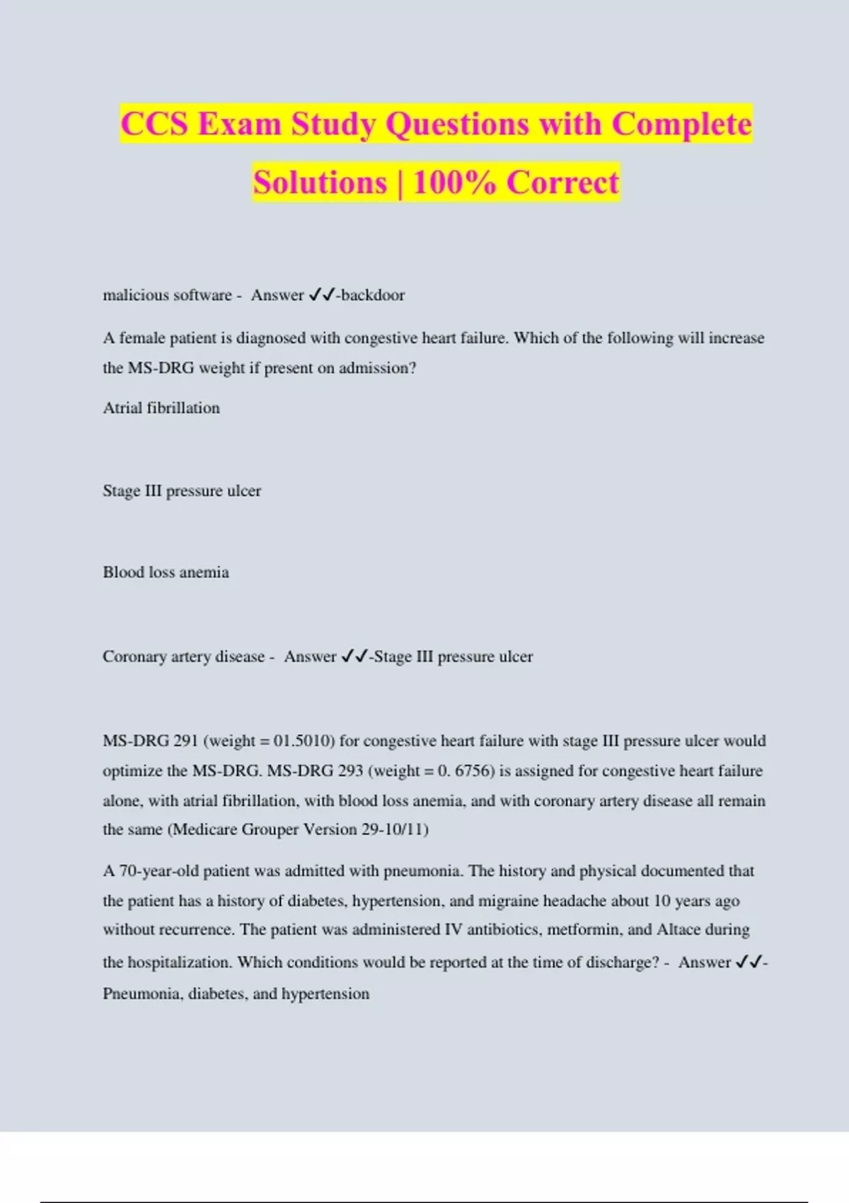 CCS Exam Study Questions with Complete Solutions | 100% Correct malicious software - Answer ️️ -backdoor A female patient is diagnosed with congestive heart failure. Which of the following will increase the MS-DRG weight if present on admission? Atrial fibrillation Stage III pressure ulcer Blood loss anemia Coronary artery disease - Answer ️️ -Stage III pressure ulcer MS-DRG 291 (weight = 01.5010) for congestive heart failure with stage III pressure ulcer would optimize the MS-DRG. MS-DRG 293 (weight = 0. 6756) is assigned for congestive heart failure alone, with atrial fibrillation, with blood loss anemia, and with coronary artery disease all remain the same (Medicare Grouper Version 29-10/11) A 70-year-old patient was admitted with pneumonia. The history and physical documented that the patient has a history of diabetes, hypertension, and migraine headache about 10 years ago without recurrence. The patient was administered IV antibiotics, metformin, and Altace during the hospitalization. Which conditions would be reported at the time of discharge? - Answer ️️ - Pneumonia, diabetes, and hypertension A patient is admitted for chest pain. The patient was stabilized and discharged. In a subsequent admission, the patient was admitted as an outpatient for a left heart catheterization, coronary arteriography using two catheters and left ventricular angiography. The patient was found to have arteriosclerotic heart disease. The patient has no history of cardiac surgery. The appropriate sequencing of ICD-9 and CPT codes for the outpatient catheterization would be: 411.1-Intermediate coronary syndrome (unstable angina) 413.9- Other and unspecified angina pectoris 414.00-Coronary atherosclerosis of unspecified type of vessel, native or graft 414.01-Coronary atherosclerosis of native coronary artery 786.50-Chest pain, unspecified 93452-Left heart catheterization including intraprocedural injection(s) for left ventriculography, imaging supervision and interpretation, when performed 93453-Combined right and left heart - Answer ️️ -414.01, 93458 Code 414.01 is assigned to show coronary artery disease in a native coronary artery and is used when a patient has coronary artery disease and no history of coronary bypass graft (CABG) surgery (Schraffenberger 2012, 190-192). Code 93458 includes intraprocedural injection(s) for left ventricular/left atrial angiography, imaging supervision, and interpretation when performed (AMA CPT Professional Edition 2013, Cardiac Catheterization Guidelines, 500-503). According to CPT, an endoscopy that is undertaken to the level of the midtransverse colon would be coded as a - Answer ️️ -colonoscopy A chest x-ray done to evaluate a chronic cough revealed a asymptomatic compression fracture of a lumbar vertebrae. No further evaluation was undertaken. The coder should: Not assign a code for an acute condition but assign a code for chronic compression fracture Assign a code for pathologic lumbar compression fracture Assign a code for acute traumatic vertebral fracture Not assign a code for this condition - Answer ️️ -Not assign a code for this condition Do not assign a code for this condition because this is a frequent condition in the elderly, is asymptomatic, and there is no documentation of treating the condition so it should not be coded (Brown 2012, 33). A patient is admitted with hypotension due to dobutamine taken, administered, and prescribed correctly. How should this be coded? - Answer ️️ -Code 458.2, Iatrogenic hypotension, should be assigned to describe this condition. This code should be assigned when hypotension develops as a result of any type of medical care. Assign code E941.2, Sympathomimetics (adrenergics), to indicate that it is an adverse effect of the drug MS-DRG assignment is based on information that includes - Answer ️️ -Diagnoses (principal and secondary); Surgical procedures (principal and secondary; Discharge disposition or status; Presence of major or other complications and comorbidities (MCC or CC as secondary diagnosis) These elements are used to determine the MS-DRG) MS-DRG assignment goes through four steps: - Answer ️️ -Pre-MDC assignments, MDC determination, Medical/surgical determination, and refinement If a patient has an excision of a malignant lesion of the skin, the CPT code is determined by the body area from which the excision occurs and the - Answer ️️ -Diameter of the lesion as well as the margins excised as described in the operative report The operative report should be reviewed for the body part involved with the lesion. The total size of the excised area, including margins, is needed for accurate coding. The pathology report typically provides the specimen size rather than the lesion or excised size. Because the specimen tends to shrink, this is not an accurate measurement according to the intent of the code assignment The case-mix index for the information provided above is: MS-DRG Weight Number of Patients MS-DRG 193, Simple pneumonia and pleurisy age >17 w/ CC; WEIGHT 3.0; # of patients 10 MS-DRG 195, Simple pneumonia without MCC or CC 2.0; 10 MS-DRG 192, Chronic obstructive pulmonary disease w/o CC 1.0; 10 - Answer ️️ -2.0 The case mix is defined as a methods of grouping patients. MS-DRGs are often used to determine case mix in hospitals. The case-mix index is the average MS-DRG weight based on the specific patient group and is determined by multiplying the DRG weights by the number of patients and then divided by the total number of patients: 30 + 20 + 10 = 60 / 30 = 2.0 75-year-old woman is admitted to the hospital after tripping and falling at home. She underwent an open reduction with internal fixation of the femur. Which of the following would be important to capture in addition to diagnostic codes? - Answer ️️ -E codes for Cause of Injury, Place of Occurrence, Activity, and Status External cause of injury codes are used to provide information about how an injury occurred