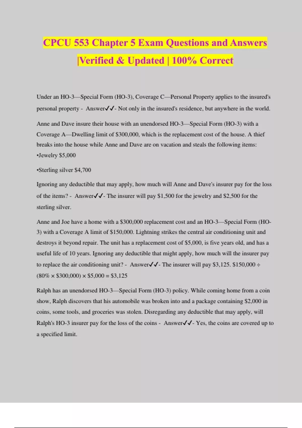 CPCU 553 Chapter 5 Exam Questions and Answers |Verified & Updated | 100% Correct Under an HO-3—Special Form (HO-3), Coverage C—Personal Property applies to the insured's personal property - Answer️️ - Not only in the insured's residence, but anywhere in the world. Anne and Dave insure their house with an unendorsed HO-3—Special Form (HO-3) with a Coverage A—Dwelling limit of $300,000, which is the replacement cost of the house. A thief breaks into the house while Anne and Dave are on vacation and steals the following items: •Jewelry $5,000 •Sterling silver $4,700 Ignoring any deductible that may apply, how much will Anne and Dave's insurer pay for the loss of the items? - Answer️️ - The insurer will pay $1,500 for the jewelry and $2,500 for the sterling silver