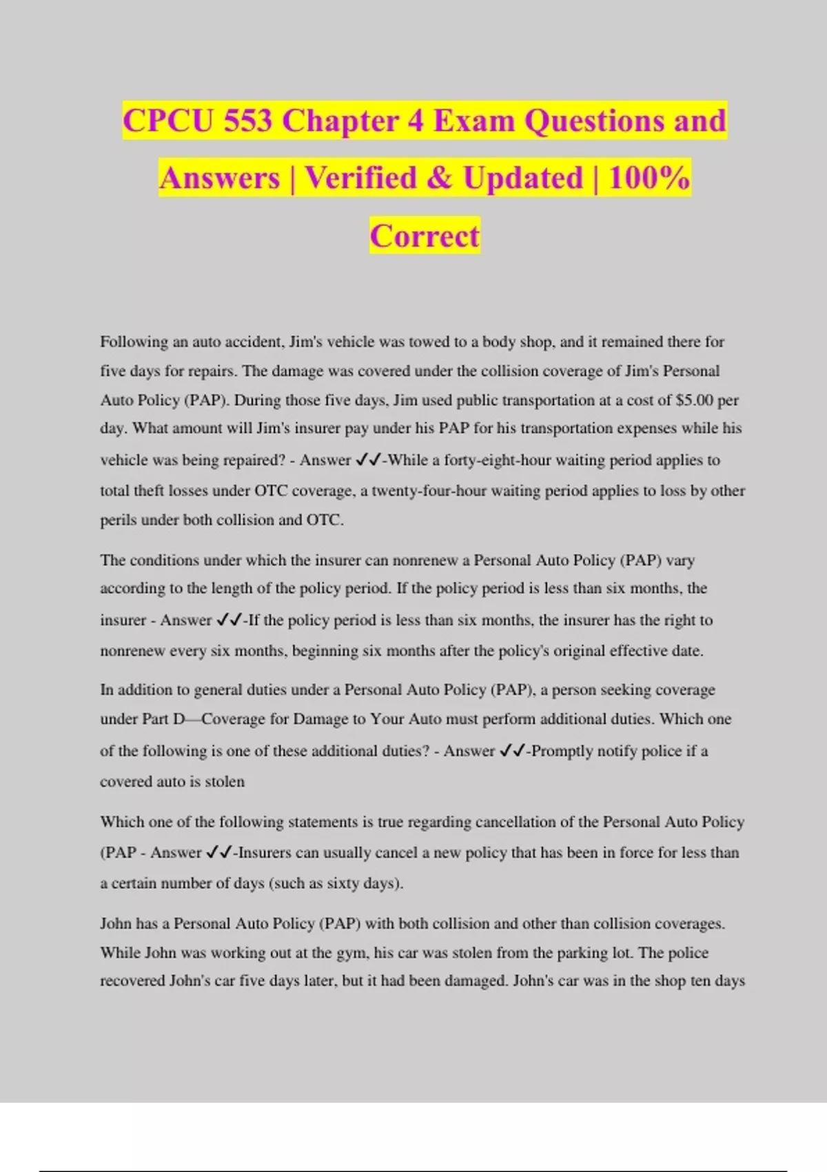 CPCU 553 Chapter 4 Exam Questions and Answers | Verified & Updated | 100% Correct Following an auto accident, Jim's vehicle was towed to a body shop, and it remained there for five days for repairs. The damage was covered under the collision coverage of Jim's Personal Auto Policy (PAP). During those five days, Jim used public transportation at a cost of $5.00 per day. What amount will Jim's insurer pay under his PAP for his transportation expenses while his vehicle was being repaired? - Answer ️️ -While a forty-eight-hour waiting period applies to total theft losses under OTC coverage, a twenty-four-hour waiting period applies to loss by other perils under both collision and OTC. The conditions under which the insurer can nonrenew a Personal Auto Policy (PAP) vary according to the length of the policy period. If the policy period is less than six months, the insurer - Answer ️️ -If the policy period is less than six months, the insurer has the right to nonrenew every six months, beginning six months after the policy's original effective date. In addition to general duties under a Personal Auto Policy (PAP), a person seeking coverage under Part D—Coverage for Damage to Your Auto must perform additional duties. Which one of the following is one of these additional duties? - Answer ️️ -Promptly notify police if a covered auto is stolen Which one of the following statements is true regarding cancellation of the Personal Auto Policy (PAP - Answer ️️ -Insurers can usually cancel a new policy that has been in force for less than a certain number of days (such as sixty days). John has a Personal Auto Policy (PAP) with both collision and other than collision coverages. While John was working out at the gym, his car was stolen from the parking lot. The police recovered John's car five days later, but it had been damaged. John's car was in the shop ten days for repairs. For what number of days will John's insurer pay him for transportation expenses? - Answer ️️ -5 + 10 - 2 = 13. A forty-eight-hour waiting period applies to total theft losses under OTC coverag