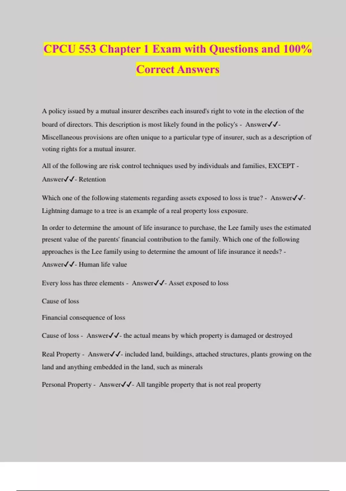 CPCU 553 Chapter 1 Exam with Questions and 100% Correct Answers A policy issued by a mutual insurer describes each insured's right to vote in the election of the board of directors. This description is most likely found in the policy's - Answer️️ - Miscellaneous provisions are often unique to a particular type of insurer, such as a description of voting rights for a mutual insurer. All of the following are risk control techniques used by individuals and families, EXCEPT - Answer️️ - Retention Which one of the following statements regarding assets exposed to loss is true? - Answer️️ - Lightning damage to a tree is an example of a real property loss exposure. In order to determine the amount of life insurance to purchase, the Lee family uses the estimated present value of the parents' financial contribution to the family. Which one of the following approaches is the Lee family using to determine the amount of life insurance it needs? - Answer️️ - Human life value Every loss has three elements - Answer️️ - Asset exposed to loss Cause of loss Financial consequence of loss Cause of loss - Answer️️ - the actual means by which property is damaged or destroyed Real Property - Answer️️ - included land, buildings, attached structures, plants growing on the land and anything embedded in the land, such as minerals Personal Property - Answer️️ - All tangible property that is not real property
