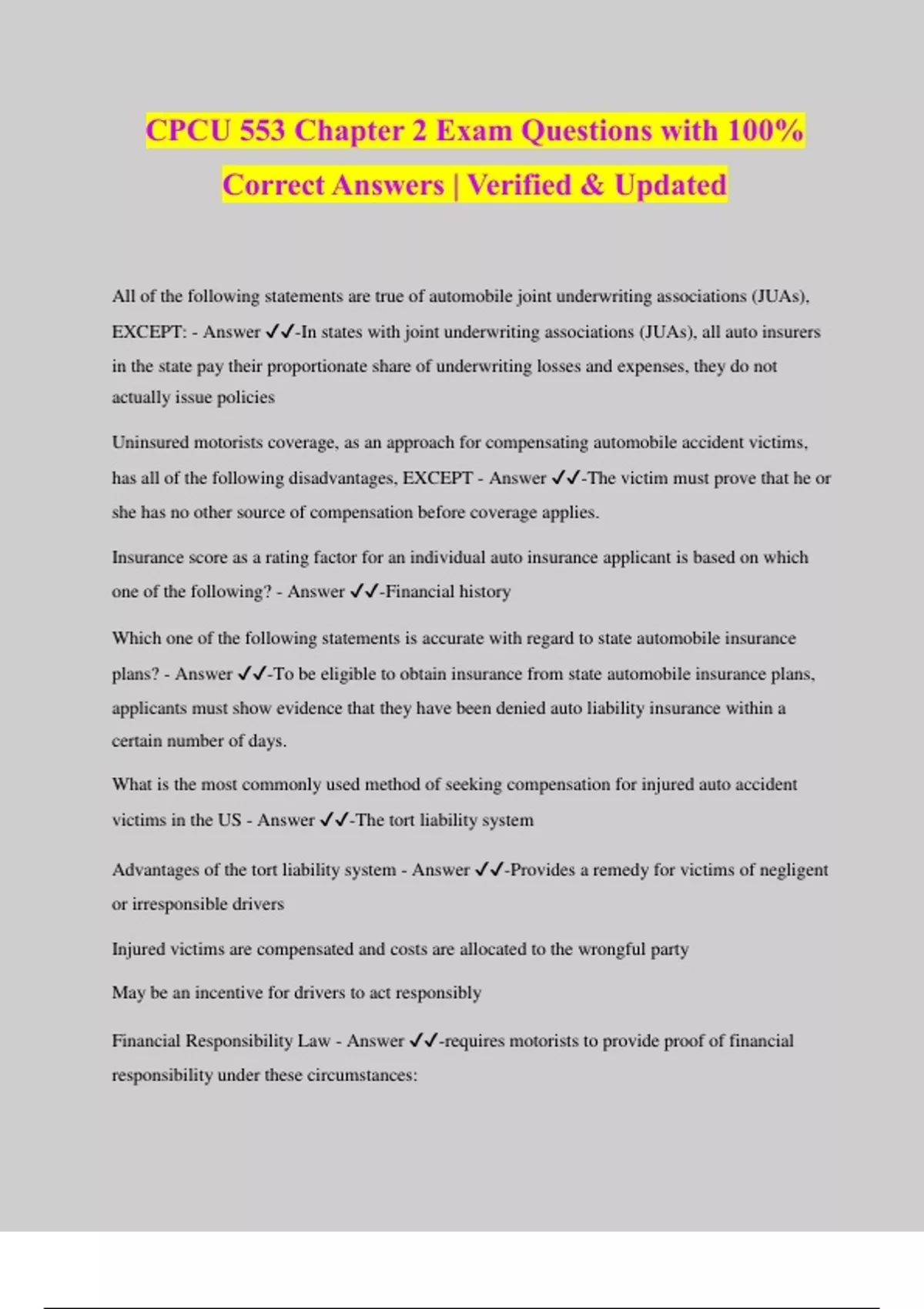 CPCU 553 Chapter 2 Exam Questions with 100% Correct Answers | Verified & Updated All of the following statements are true of automobile joint underwriting associations (JUAs), EXCEPT: - Answer ️️ -In states with joint underwriting associations (JUAs), all auto insurers in the state pay their proportionate share of underwriting losses and expenses, they do not actually issue policies Uninsured motorists coverage, as an approach for compensating automobile accident victims, has all of the following disadvantages, EXCEPT - Answer ️️ -The victim must prove that he or she has no other source of compensation before coverage applies. Insurance score as a rating factor for an individual auto insurance applicant is based on which one of the following? - Answer ️️ -Financial history Which one of the following statements is accurate with regard to state automobile insurance plans? - Answer ️️ -To be eligible to obtain insurance from state automobile insurance plans, applicants must show evidence that they have been denied auto liability insurance within a certain number of days. What is the most commonly used method of seeking compensation for injured auto accident victims in the US - Answer ️️ -The tort liability system Advantages of the tort liability system - Answer ️️ -Provides a remedy for victims of negligent or irresponsible drivers Injured victims are compensated and costs are allocated to the wrongful party May be an incentive for drivers to act responsibly Financial Responsibility Law - Answer ️️ -requires motorists to provide proof of financial responsibility under these circumstances: