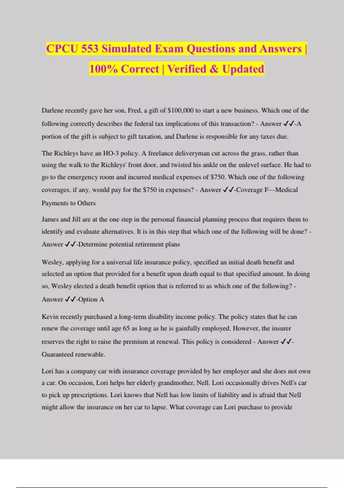 CPCU 553 Simulated Exam Questions and Answers | 100% Correct | Verified & Updated Darlene recently gave her son, Fred, a gift of $100,000 to start a new business. Which one of the following correctly describes the federal tax implications of this transaction? - Answer ️️ -A portion of the gift is subject to gift taxation, and Darlene is responsible for any taxes due. The Richleys have an HO-3 policy. A freelance deliveryman cut across the grass, rather than using the walk to the Richleys' front door, and twisted his ankle on the unlevel surface. He had to go to the emergency room and incurred medical expenses of $750. Which one of the following coverages, if any, would pay for the $750 in expenses? - Answer ️️ -Coverage F—Medical Payments to Others James and Jill are at the one step in the personal financial planning process that requires them to identify and evaluate alternatives. It is in this step that which one of the following will be done? - Answer ️️ -Determine potential retirement plans Wesley, applying for a universal life insurance policy, specified an initial death benefit and selected an option that provided for a benefit upon death equal to that specified amount. In doing so, Wesley elected a death benefit option that is referred to as which one of the following? - Answer ️️ -Option A Kevin recently purchased a long-term disability income policy. The policy states that he can renew the coverage until age 65 as long as he is gainfully employed. However, the insurer reserves the right to raise the premium at renewal. This policy is considered - Answer ️️ - Guaranteed renewable. Lori has a company car with insurance coverage provided by her employer and she does not own a car. On occasion, Lori helps her elderly grandmother, Nell. Lori occasionally drives Nell's car to pick up prescriptions. Lori knows that Nell has low limits of liability and is afraid that Nell might allow the insurance on her car to lapse. What coverage can Lori purchase to provide