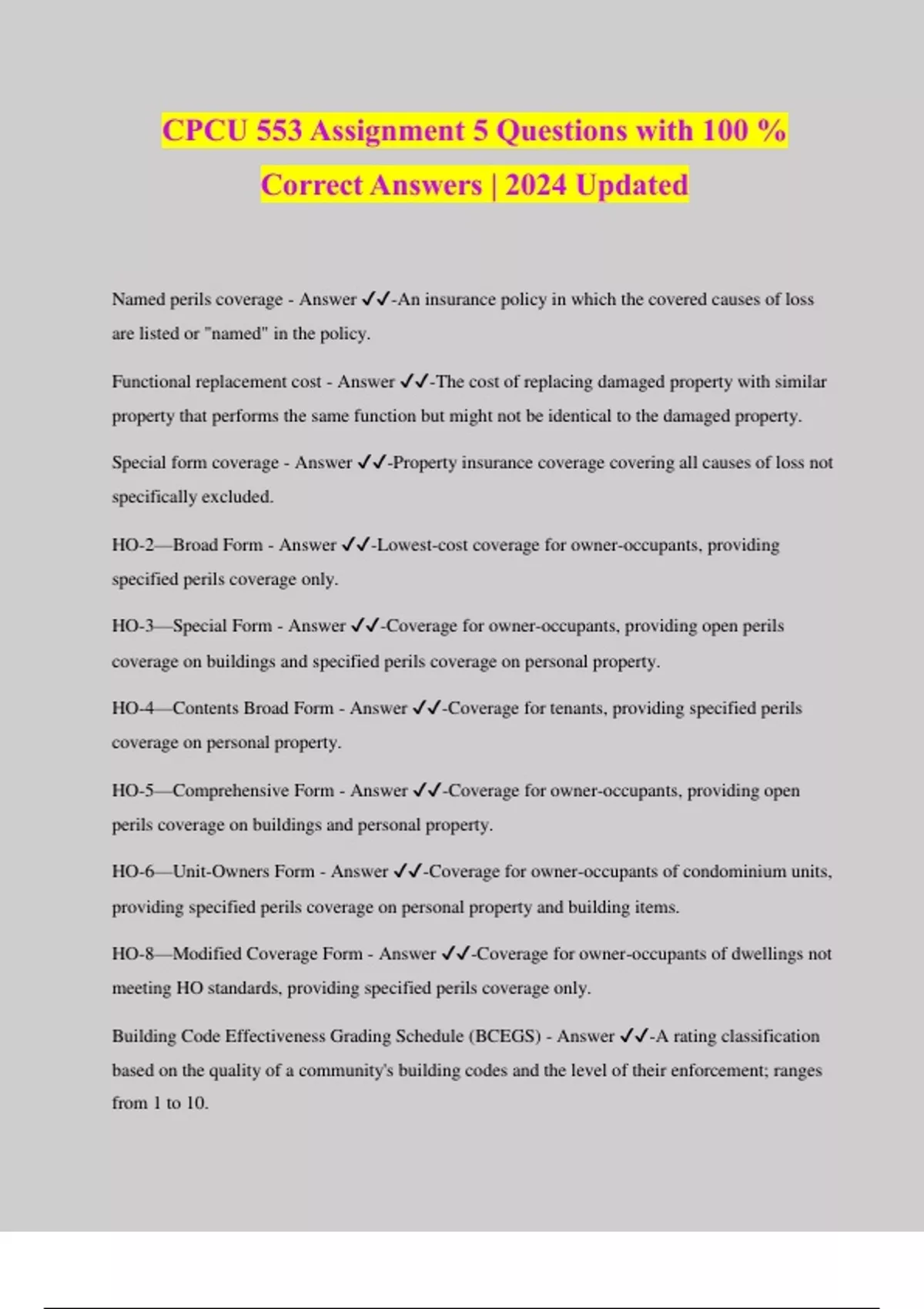 CPCU 553 Assignment 5 Questions with 100 % Correct Answers | 2024 Updated Named perils coverage - Answer ️️ -An insurance policy in which the covered causes of loss are listed or "named" in the policy. Functional replacement cost - Answer ️️ -The cost of replacing damaged property with similar property that performs the same function but might not be identical to the damaged property. Special form coverage - Answer ️️ -Property insurance coverage covering all causes of loss not specifically excluded. HO-2—Broad Form - Answer ️️ -Lowest-cost coverage for owner-occupants, providing specified perils coverage only. HO-3—Special Form - Answer ️️ -Coverage for owner-occupants, providing open perils coverage on buildings and specified perils coverage on personal property. HO-4—Contents Broad Form - Answer ️️ -Coverage for tenants, providing specified perils coverage on personal property. HO-5—Comprehensive Form - Answer ️️ -Coverage for owner-occupants, providing open perils coverage on buildings and personal property