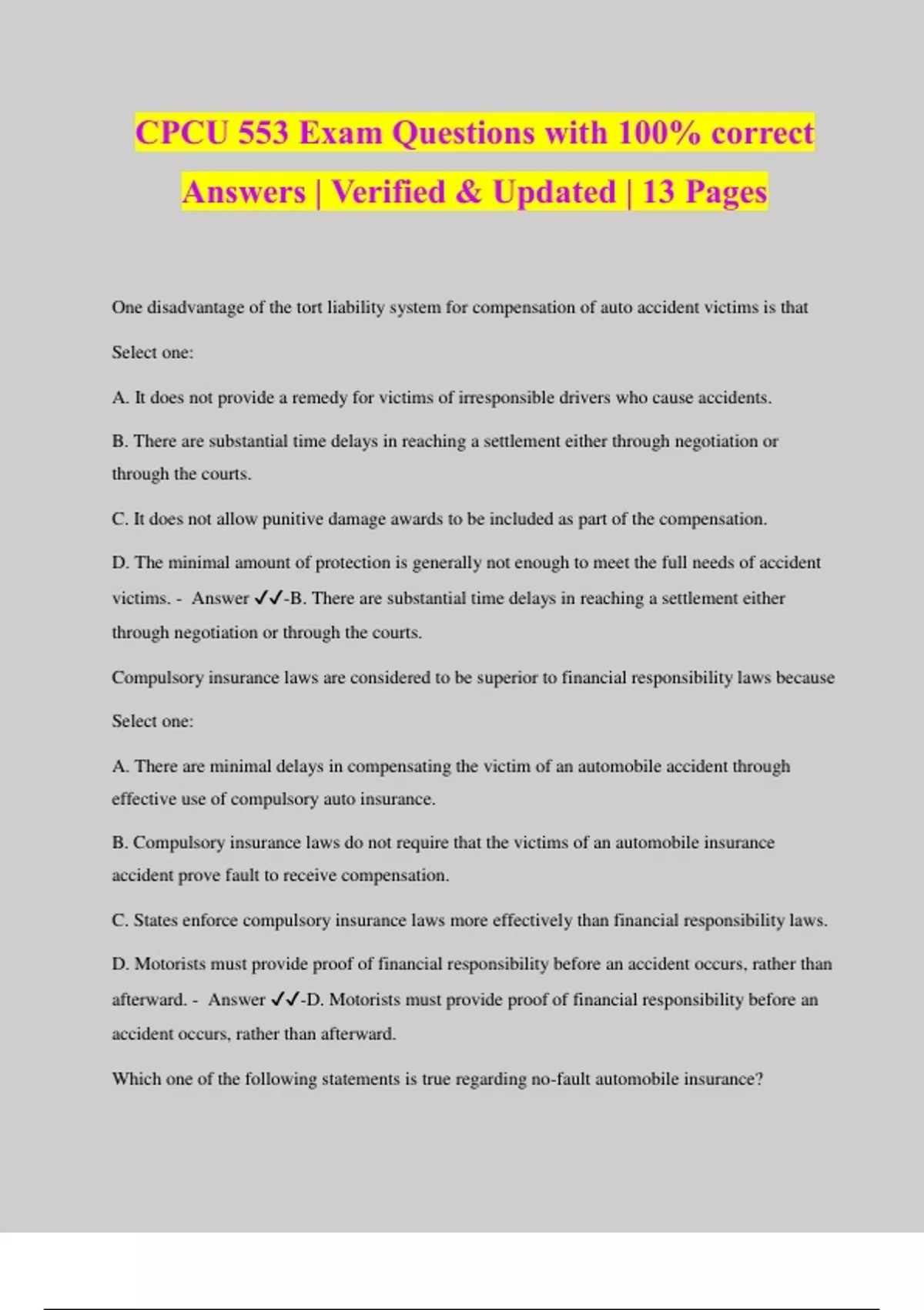 CPCU 553 Exam Questions with 100% correct Answers | Verified & Updated | 13 Pages One disadvantage of the tort liability system for compensation of auto accident victims is that Select one: A. It does not provide a remedy for victims of irresponsible drivers who cause accidents. B. There are substantial time delays in reaching a settlement either through negotiation or through the courts. C. It does not allow punitive damage awards to be included as part of the compensation. D. The minimal amount of protection is generally not enough to meet the full needs of accident victims. - Answer ️️ -B. There are substantial time delays in reaching a settlement either through negotiation or through the courts. Compulsory insurance laws are considered to be superior to financial responsibility laws because Select one: A. There are minimal delays in compensating the victim of an automobile accident through effective use of compulsory auto insurance. B. Compulsory insurance laws do not require that the victims of an automobile insurance accident prove fault to receive compensation. C. States enforce compulsory insurance laws more effectively than financial responsibility laws. D. Motorists must provide proof of financial responsibility before an accident occurs, rather than afterward. - Answer ️️ -D. Motorists must provide proof of financial responsibility before an accident occurs, rather than afterward. Which one of the following statements is true regarding no-fault automobile insurance? Select one: A. Under a no-fault system, an injured person does not need to establish fault, but must prove negligence in order to collect payment for damages. B. Most no-fault laws apply only to bodily injury and not to property damage. C. No-fault laws typically provide no benefits for loss of earnings for an injured person. D. An injured party must sue to obtain medical expenses above a particular monetary threshold in all no-fault plans. - Answer ️️ -B. Most no-fault laws apply only to bodily injury and not to property damage. Marcia has sustained serious injuries in an automobile accident with another driver. If the no- fault automobile insurance law in Marcia's state permits her to sue the other driver for economic damages only if her economic damages exceed her no-fault coverage limit, what type of no-fault law applies in Marcia's state? Select one: A. Modified no-fault B. Pure no-fault C. Add-on no-fault D. Personal injury protection - Answer ️️ -A. Modified no-fault In a state with a reinsurance facility for high-risk drivers, a private insurer that does not want to bear the risk of a high-risk applicant may Select one: A. Assign the application to the reinsurance facility to be underwritten and serviced. B. Accept and service the policy, but collect excess losses from the reinsurance facility. C. Assign the premium and losses to the reinsurance facility, and continue to service the policy. D. Accept the application, but assign servicing and losses to members of the reinsurance facility pool on a proportional basis. - Answer ️️ -C. Assign the premium and losses to the reinsurance facility, and continue to service the policy. The Part B—Medical Payments Coverage of the Personal Auto Policy (PAP) contains an Other Insurance provision. If two automobile policies from differen