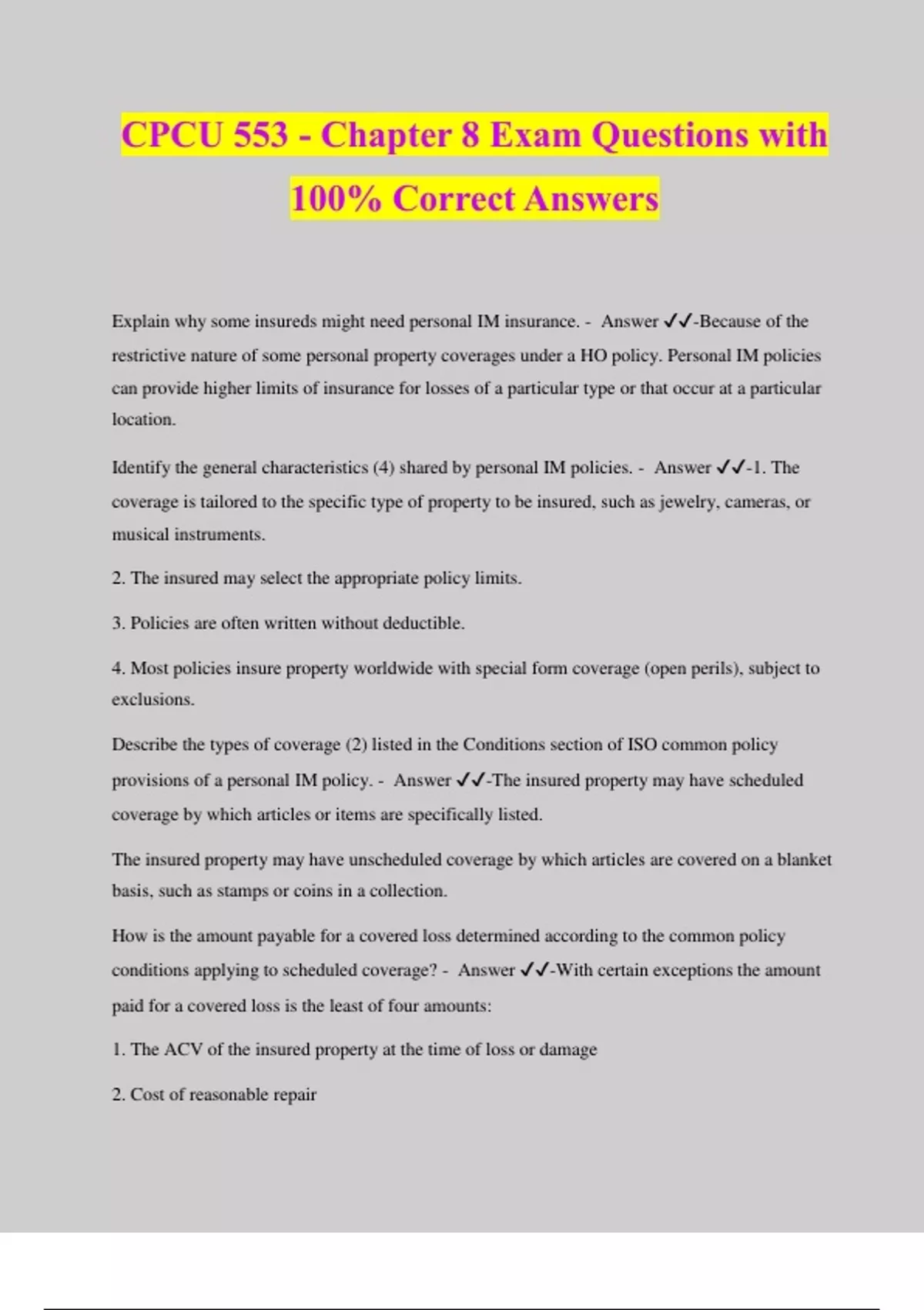 CPCU 553 - Chapter 8 Exam Questions with 100% Correct Answers Explain why some insureds might need personal IM insurance. - Answer ️️ -Because of the restrictive nature of some personal property coverages under a HO policy. Personal IM policies can provide higher limits of insurance for losses of a particular type or that occur at a particular location. Identify the general characteristics (4) shared by personal IM policies. - Answer ️️ -1. The coverage is tailored to the specific type of property to be insured, such as jewelry, cameras, or musical instruments. 2. The insured may select the appropriate policy limits. 3. Policies are often written without deductible. 4. Most policies insure property worldwide with special form coverage (open perils), subject to exclusions. Describe the types of coverage (2) listed in the Conditions section of ISO common policy provisions of a personal IM policy. - Answer ️️ -The insured property may have scheduled coverage by which articles or items are specifically listed. The insured property may have unscheduled coverage by which articles are covered on a blanket basis, such as stamps or coins in a collection. How is the amount payable for a covered loss determined according to the common policy conditions applying to scheduled coverage? - Answer ️️ -With certain exceptions the amount paid for a covered loss is the least of four amounts: 1. The ACV of the insured property at the time of loss or damage 2. Cost of reasonable repair 3. Cost of replacement with property substantially identical 4. Amount of insurance stated in the policy What are the two types of coverage forms (1+3) available in the ISO personal IM program? - Answer ️️ -1. Specialized forms: used to cover a single category of personal property, such as outboard motors, fine arts, cameras, or motorized golf carts. 2. General forms: broader and generic in nature. There are three types: personal articles standard loss settlement form, personal property form, and personal effects form). Commonly used to provide coverage on a single form for many kinds of personal property. Describe the type of coverage provided by the personal articles standard loss settlement form of the ISO personal IM program. - Answer ️️ -It provides special form coverage for any of several classes of personal property, including jewelry, furs, cameras, musical instruments, silverware, fine arts, stamps and coin collections. A specific amount of insurance is shown in the policy for each class of property or for each specific article. Describe the type of coverage provided by the personal property form of the ISO personal IM program. - Answer ️️ -It provides special form coverage on unscheduled personal property owned or used by the insured and normally kept at the insured's residence. It provides worldwide coverage when the property is temporarily away from the residence. It can be used to insure 13 classes of unscheduled personal property, such as silverware, cameras, and major appliances. Explain why the Personal Effects Form of the ISO personal IM program is designed for frequent travelers. - Answer ️️ -Because it provides special form coverage on personal property such as luggage, clothes, cameras, and sports equipment normally worn or carried by tourists and travelers. The form covers property worldwide, but only while the property is away from the insured's permanent residence. Why do certain personal insurance policies limit or restrict coverage for watercraft or watercraft- related coverage? - Answer ️️ -Because they are used on bodies of water for recreational purpose and few restrictions apply to their op