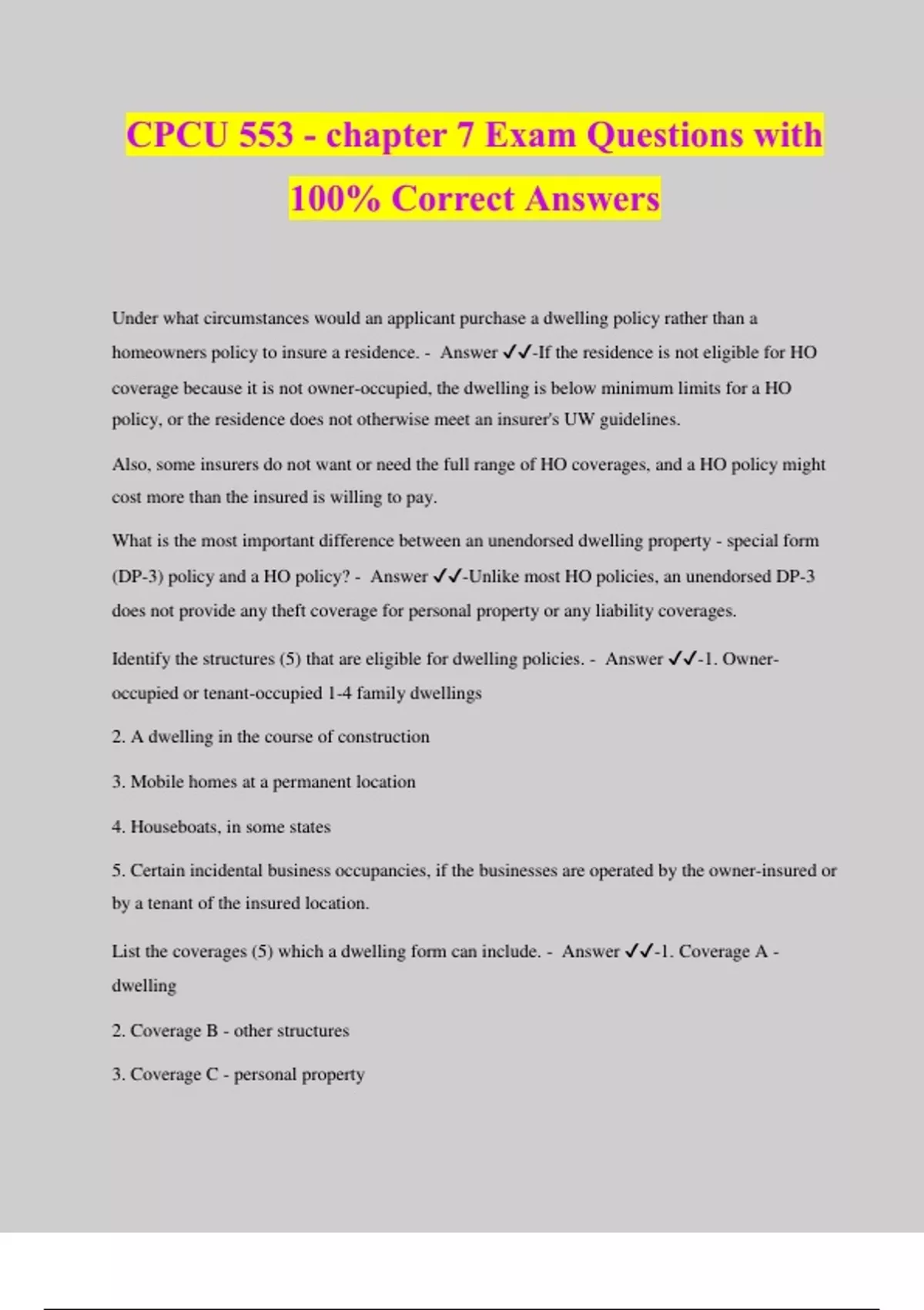 CPCU 553 - chapter 7 Exam Questions with 100% Correct Answers Under what circumstances would an applicant purchase a dwelling policy rather than a homeowners policy to insure a residence. - Answer ️️ -If the residence is not eligible for HO coverage because it is not owner-occupied, the dwelling is below minimum limits for a HO policy, or the residence does not otherwise meet an insurer's UW guidelines. Also, some insurers do not want or need the full range of HO coverages, and a HO policy might cost more than the insured is willing to pay. What is the most important difference between an unendorsed dwelling property - special form (DP-3) policy and a HO policy? - Answer ️️ -Unlike most HO policies, an unendorsed DP-3 does not provide any theft coverage for personal property or any liability coverages. Identify the structures (5) that are eligible for dwelling policies. - Answer ️️ -1. Owner- occupied or tenant-occupied 1-4 family dwellings 2. A dwelling in the course of construction 3. Mobile homes at a permanent location 4. Houseboats, in some states 5. Certain incidental business occupancies, if the businesses are operated by the owner-insured or by a tenant of the insured location. List the coverages (5) which a dwelling form can include. - Answer ️️ -1. Coverage A - dwelling 2. Coverage B - other structures 3. Coverage C - personal property 4. Coverage D - fair rental value 5. Coverage E - additional living expense How does the availability of property coverages under the dwelling policy differ from the availability of property coverages under the HO policy? - Answer ️️ -The same property coverages can apply under the dwelling policy that are included under the HO policy; however, under the dwelling policy, each desired coverage must be listed with a limit on the dec page for the coverage to apply. Coverage D and E, however, are automatically included in the DP-3. In contrast, under the HO policy, all of these coverages apply automatically. How does coverage A - dwelling coverage under the DP-3 differ from that coverage under the HO-3? - Answer ️️ -The DP-3 refers to the dwelling on the insured location. In contrast HO-3 refers to the dwelling including attached structures. The DP-3 also states that coverage is provided for building and outdoor equipment used for the service of the premises and located on the described location, unless it is covered elsewhere in the policy. Under the HO-3 this property is covered under coverage C. How are gravemarkers and mausoleums treated differently under the DP-3 coverage B compared with treatment of such property under the HO-3? - Answer ️️ -Under the DP-3 coverage B, gravemarkers and mausoleums are specifically excluded. In contrast, the HO-3 additional coverages provides up to $5,000 for gravemarkers. Under the DP-3, when coverage C is selected and specified with a limit on the dec, how does the coverage differ from property covered under special limits of liability in coverage C of the HO- 3? - Answer ️️ -The HO-3 coverage C specifies special limits that apply to specific types of personal property. Because the perils and some coverages differ under the DP-3 policy, these limits are not necessary; therefore, no specified limits apply for specific types of property. How does coverage D and E under the DP-3 compare to comparable coverages under the HO-3? - Answer ️️ -Coverage D and E in the DP-3 form correspond roughly to coverage D in the HO- 3 form (which essentially provides coverage for both). Coverage D covers the fair rental value of a property rented to others when it becomes unfit for normal use because of a covered loss. Coverage E covers the increase in living expenses when the described property becomes unfit for normal use because of a covered loss. Explain how the coverage "Other Structures" as describe in the Other Coverage section under the DP-3 differ from any comparable coverages under the HO-3: - Answer ️️ -The DP-3 firm provides up to 10% of the coverage A limit for coverage B. This additional insurance amount does not reduce the coverage A limit for the same loss. HO-3 provides essentially the same coverage (exception gravemarkers and mausoleums are excluded under the DP-3). Explain how the coverage "Improvements, Alterations, and Additions" as describe in the Other Coverage section under the DP-3 differ from any comparable coverages under the HO-3: - Answer ️️ -The DP-3 form provides 10% of the coverage C limit as additional insurance to cover a tenant's improvements, alterations, and additions for a covered loss. The HO-3 has no comparable coverage. Explain how the coverage "Worldwide Coverage" as describe in the Other Coverage section under the DP-3 differ from any comparable coverages under the HO-3: - Answer ️️ -The DP-3 form provides up to 10 % of the coverage C limit for loss to the coverage C property anywhere in the world (as does the HO-3 coverage C), except that the DP-3 coverage C excludes rowboats and canoes. Additionally, the HO-3 coverage C limits the coverage for property that is usually located at a secondary residence of the insured to 10%. Explain how the coverage "Fair rental value and additional living expenses" as describe in the Other Coverage section under the DP-3 differ from any comparable coverages under the HO-3: - Answer ️️ -The DP-3 form provides up to 20% of the coverage A limit for losses under both coverages D and E. In contrast, under the HO-3 form, the c