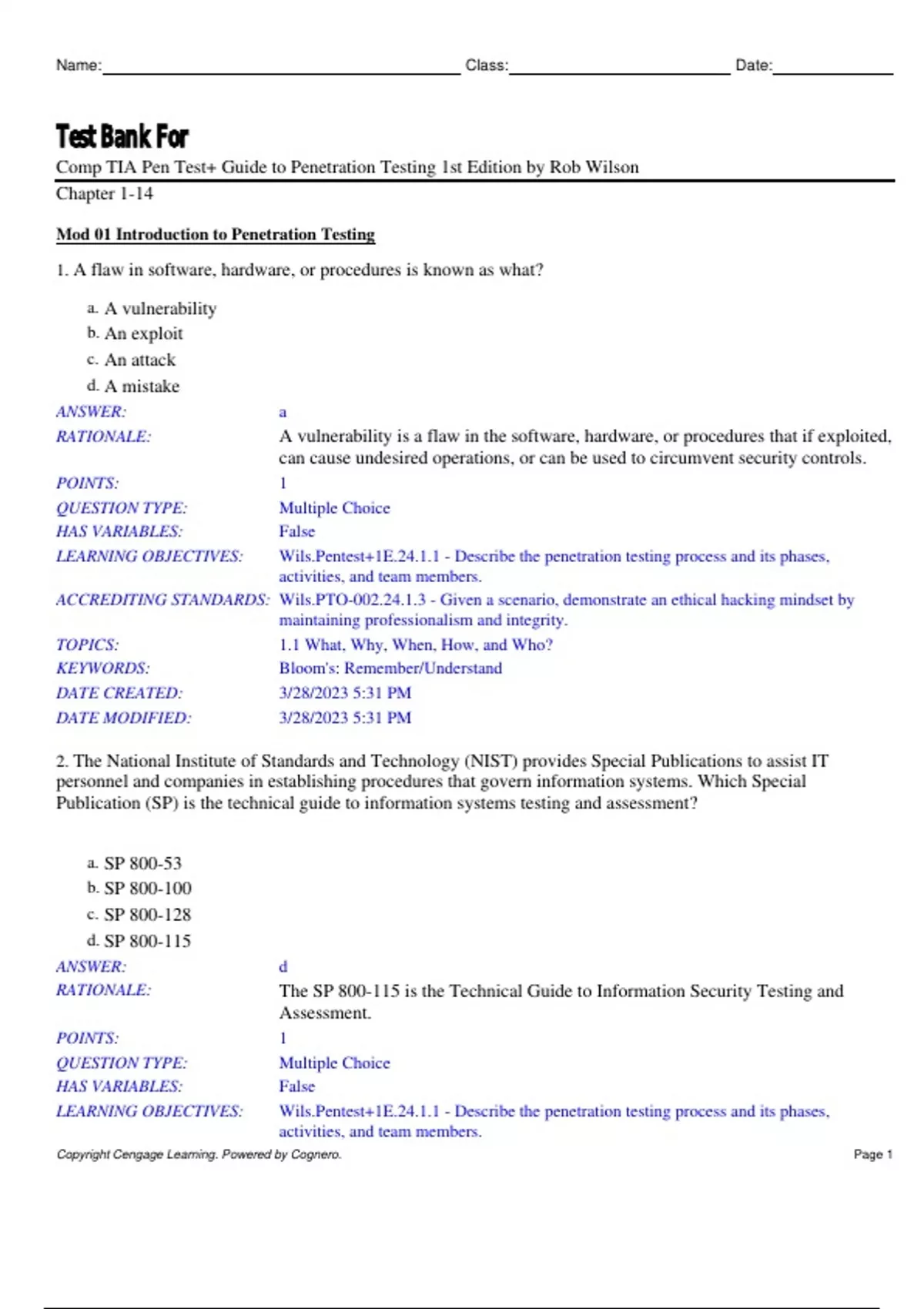 Test Bank For CompTIA PenTest+ Guide to Penetration Testing 1st Edition by Rob Wilson Chapter 1-14