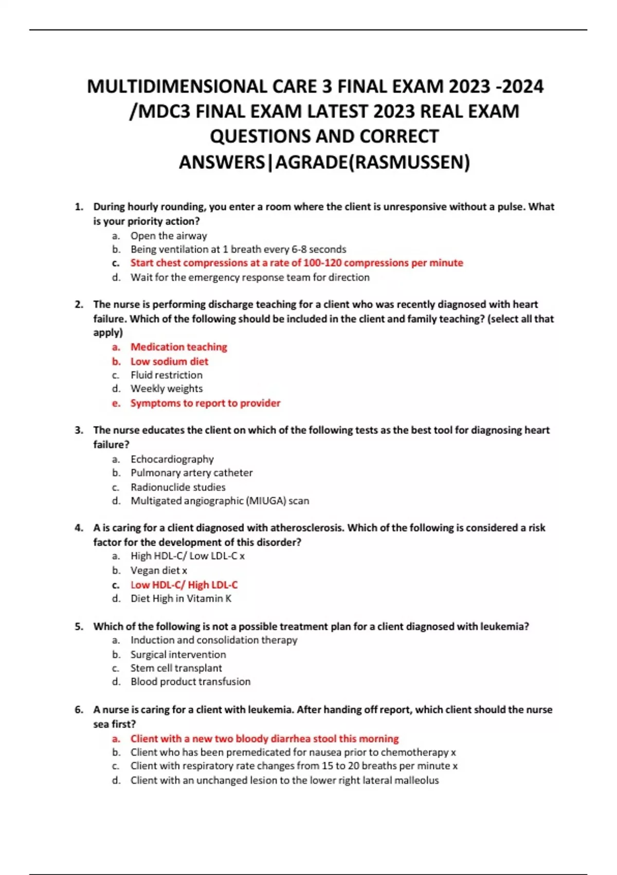 MULTIDIMENSIONAL CARE 3 FINAL EXAM /MDC3 FINAL EXAM LATEST 2023 REAL EXAM QUESTIONS AND CORRECT ANSWERS|AGRADE(RASMUSSEN) 1. During hourly rounding, you enter a room where the client is unresponsive without a pulse. What is your priority action? a. Open the airway b. Being ventilation at 1 breath every 6-8 seconds c. Start chest compressions at a rate of 100-120 compressions per minute d. Wait for the emergency response team for direction 2. The nurse is performing discharge teaching for a client who was recently diagnosed with heart failure. Which of the following should be included in the client and family teaching? (select all that apply) a. Medication teaching b. Low sodium diet c. Fluid restriction d. Weekly weights e. Symptoms to report to provider 3. The nurse educates the client on which of the following tests asthe best tool for diagnosing heart failure? a. Echocardiography b. Pulmonary artery catheter c. Radionuclide studies d. Multigated angiographic (MIUGA)scan 4. A is caring for a client diagnosed with atherosclerosis. Which of the following is considered a risk factor for the development of this disorder? a. High HDL-C/ Low LDL-C x b. Vegan diet x c. Low HDL-C/ High LDL-C d. Diet High in Vitamin K 5. Which of the following is not a possible treatment plan for a client diagnosed with leukemia? a. Induction and consolidation therapy b. Surgical intervention c. Stem cell transplant d. Blood product transfusion 6. A nurse is caring for a client with leukemia. After handing off report, which client should the nurse sea first? a. Client with a new two bloody diarrhea stool this morning b. Client who has been premedicated for nausea prior to chemotherapy x c. Client with respiratory rate changes from 15 to 20 breaths per minute x d. Client with an unchanged lesion to the lower right lateral malleolus 7. You are caring for a client who presented to the emergency department with pulmonary edema. The client is hypotensive with a pulse oximeter reading of 85% on room air. Which of the following is a nursing priority? a. Administer diuretics b. Administer IV fluids c. Administer oxygen d. Obtain a chest x-ray 8. The nurse receives an order to infuse heparin 1000 units/hr IV. The IV bag contains 25,000 units heparin in 500ML D5W. calculate the IV rates in mL/hr. mL/hr. (Record answer as a whole number. Do not include trailing zero. Answer numerically, do not label.) 20 2. A nurse caring for a client recently diagnose with leukemia. Which of the following signs and symptoms are not consistent with this diagnosis? a. Bleeding gums x b. Bone pain x c. Weight gain - loss d. Hematuria 10. Which of the following clients is most at risk of developing endocarditis? a. Explain who recently underwent a valve replacement b. A client with Marfan’s syndrome c. A client recently diagnosed with mitralstenosis d. A client who recently had a Valve replacement Ann had dental work recently performed 11. A client is receiving treatment for the diagnosis of hemophilia A. Which of the following isthe most appropriate to include in the assessment of this client? a. Appetite b. Urine output c. Joint pain and bruising d. Respiratory rate 12. Which of the following is a pharmacological treatment option for a client with dilated cardiomyopathy? (select all that apply) a. Diuretics b. Sodium tablet c. Vasodilating agent d. Phentermine 13. The nurse is discharging home a client at risk of venous thromboembolism on enoxaparin sodium. Which instruction is a priority for the nurse to provide to this client? a. “notify your healthcare provider if your stools appear tarry” b. “massage the injection site after the heparin is injected “ c. “you must have you PT/INR checked every 2 weeks” d. “you must have your aPTT check every 72 hours” 14. The nurse knows that which of the following is the most common problem for a client with valvular heart disease? a. Decrease cardiac output b. Difficulty coping c. Shortness of breath d. Altered body image 15. The client hasthrombocytopenia. Which clientstatement indicatesthe client understandsthe selfmanagement of this condition? a. “I brush and use dental floss every day” b. “I chew hard candy for my dry cough” c. “I usually put ice on bumps and bruises” d. “non slip socks are best when I walk” 16. A nurse is caring for a client diagnosed with polycythemia Vera which of the following should the nurse include in the clients and family education? a. Decrease fluid intake to no more than 1 liter per day b. Where support hose while awak