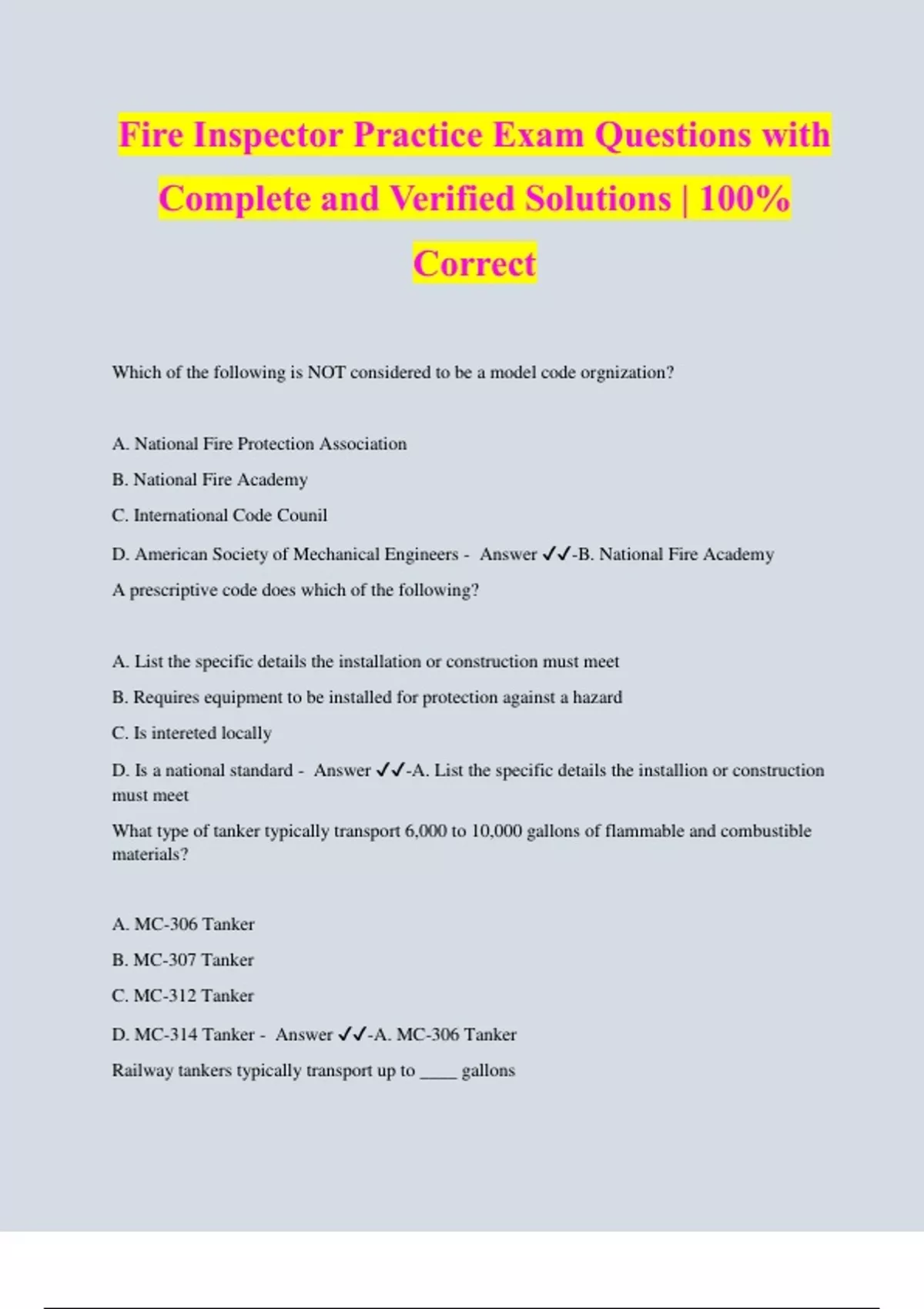 Fire Inspector Practice Exam Questions with Complete and Verified Solutions | 100% Correct Which of the following is NOT considered to be a model code orgnization? A. National Fire Protection Association B. National Fire Academy C. International Code Counil D. American Society of Mechanical Engineers - Answer ️️ -B. National Fire Academy A prescriptive code does which of the following? A. List the specific details the installation or construction must meet B. Requires equipment to be installed for protection against a hazard C. Is intereted locally D. Is a national standard - Answer ️️ -A. List the specific details the installion or construction must meet What type of tanker typically transport 6,000 to 10,000 gallons of flammable and combustible materials? A. MC-306 Tanker B. MC-307 Tanker C. MC-312 Tanker D. MC-314 Tanker - Answer ️️ -A. MC-306 Tanker Railway tankers typically transport up to ____ gallons A. 25,000 B. 30,000 C. 35,000 D. 40,000 - Answer ️️ -B. 30,000 Which items should be a top priority when evaluating the building's fire protection features? A. Exit doors B. Fire alarm systems and automatic sprinkler systems C. HVAC D. Utility locations - Answer ️️ -v What is the minimum acceptable rating for fire extinguishers? A. 1A10BC B. 2A10BC C. ABCD D. 10A10BC - Answer ️️ -B. 2A10BC A frangible bulb sprinkler head with a temperature rating of 500-575 degrees would be what color? A. Black B. Orange C. Red D. Green - Answer ️️ -A. Black NFPA ____ is the standard on dry chemical extiguishing systems. A. 17 B. 25 C. 13 D. 55 - Answer ️️ -A. 17 How thick can wood posts in a heavy timber constructed building be? A. 2" B. 4" C. 6" D. 8" - Answer ️️ -D. 8" (20.3cm) NFPA ____ is the standard for fire safety an