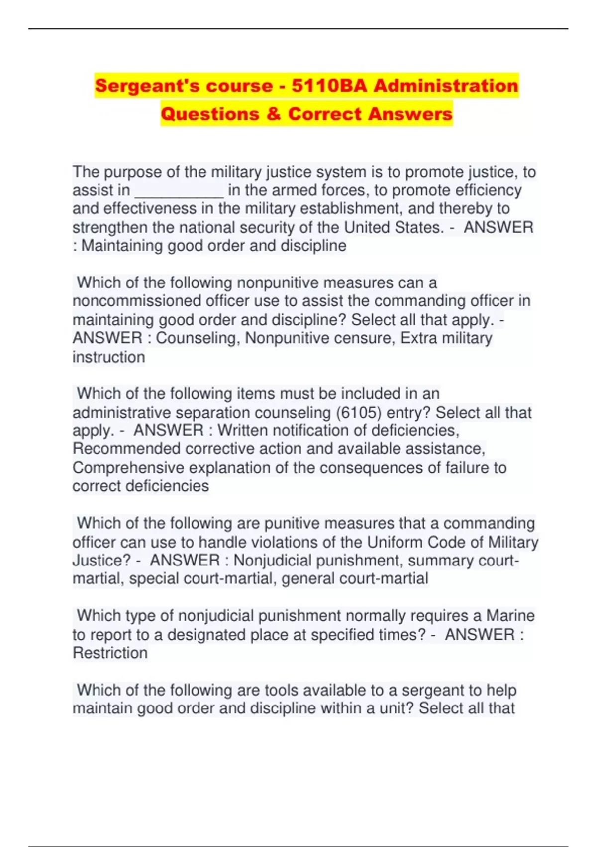 Sergeant's course - 5110BA Administration Questions & Correct Answers The purpose of the military justice system is to promote justice, to assist in __________ in the armed forces, to promote efficiency and effectiveness in the military establishment, and thereby to strengthen the national security of the United States. - ANSWER : Maintaining good order and discipline Which of the following nonpunitive measures can a noncommissioned officer use to assist the commanding officer in maintaining good order and discipline? Select all that apply. - ANSWER : Counseling, Nonpunitive censure, Extra military instruction Which of the following items must be included in an administrative separation counseling (6105) entry? Select all that apply. - ANSWER : Written notification of deficiencies, Recommended corrective action and available assistance, Comprehensive explanation of the consequences of failure to correct deficiencies Which of the following are punitive measures that a commanding officer can use to handle violations of the Uniform Code of Military Justice? - ANSWER : Nonjudicial punishment, summary courtmartial, special court-martial, general court-martial Which type of nonjudicial punishment normally requires a Marine to report to a designated place at specified times? - ANSWER : Restriction Which of the following are tools available to a sergeant to help maintain good order and discipline within a unit? Select all that apply. - ANSWER : Counseling, Extra military instruction, Charge sheet