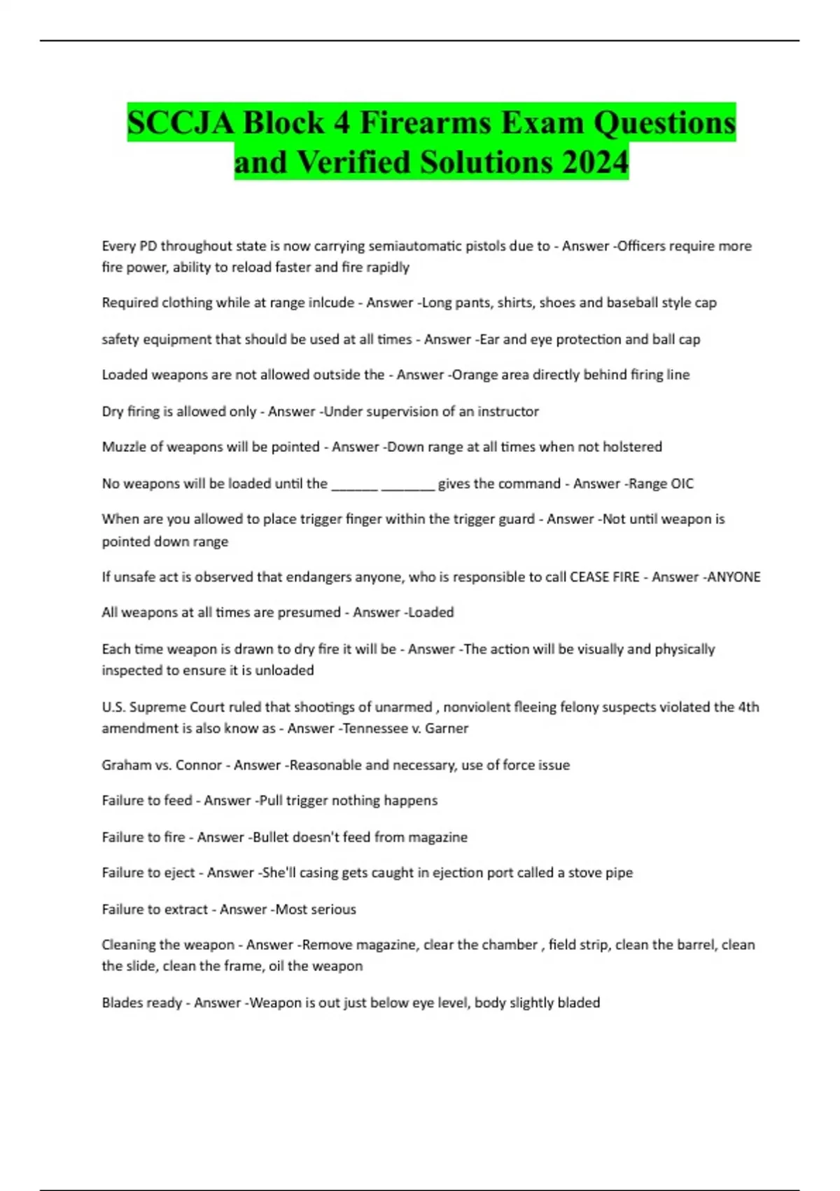 SCCJA Block 4 Firearms Exam Questions and Verified Solutions 2024 Every PD throughout state is now carrying semiautomatic pistols due to - Answer -Officers require more fire power, ability to reload faster and fire rapidly Required clothing while at range inlcude - Answer -Long pants, shirts, shoes and baseball style cap safety equipment that should be used at all times - Answer -Ear and eye protection and ball cap Loaded weapons are not allowed outside the - Answer -Orange area directly behind firing line Dry firing is allowed only - Answer -Under supervision of an instructor Muzzle of weapons will be pointed - Answer -Down range at all times when not holstered No weapons will be loaded until the ______ _______ gives the command - Answer -Range OIC When are you allowed to place trigger finger within the trigger guard - Answer -Not until weapon is pointed down range If unsafe act is observed that endangers anyone, who is responsible t