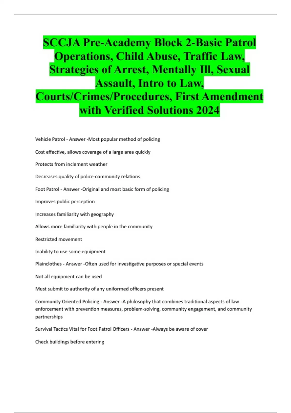 SCCJA Pre-Academy Block 2-Basic Patrol Operations, Child Abuse, Traffic Law, Strategies of Arrest, Mentally Ill, Sexual Assault, Intro to Law, Courts/Crimes/Procedures, First Amendment with Verified Solutions 2024 Vehicle Patrol - Answer -Most popular method of policing Cost effective, allows coverage of a large area quickly Protects from inclement weather Decreases quality of police-community relations Foot Patrol - Answer -Original and most basic form of policing Improves public perception Increases familiarity with geography Allows more familiarity with people in the community Restricted movement Inability to use some equipment Plainclothes - Answer -Often used for investigative purposes or special events Not all equipment can be used Must submit to authority of any uniformed officers present Community Oriented Policing - Answer -A philosophy that combines traditional aspects of law enforcement with prevention measures, problem-solving, community engagement, and community partnerships Survival Tactics Vital for Foot Patrol Officers - Answer -Always be aware of cover Check buildings before enteringPay attention to nearby vehicles Approach people at a safe distance Use darkness to your advantage Use proper light discipline Wait for backup if necessary Examples of Community Oriented Policing Programs - Answer -Neighborhood Watch Citizen Patrol Citizen Police Academy Citizen surveys Problem solving step process for staff Community partnerships Foot patrols Ride-alongs