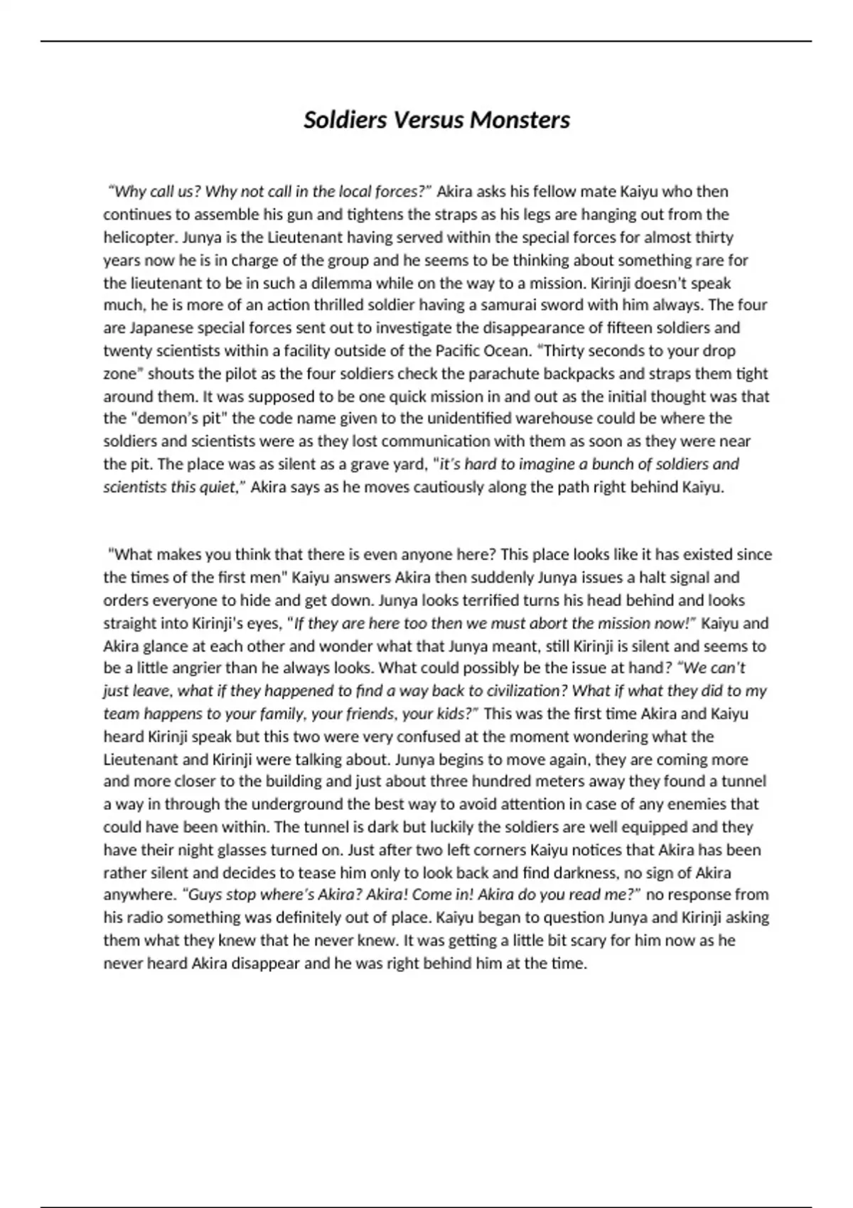 This is an exciting short story that entails a battle between soldiers and the monsters of this world. A very entertaining fiction.