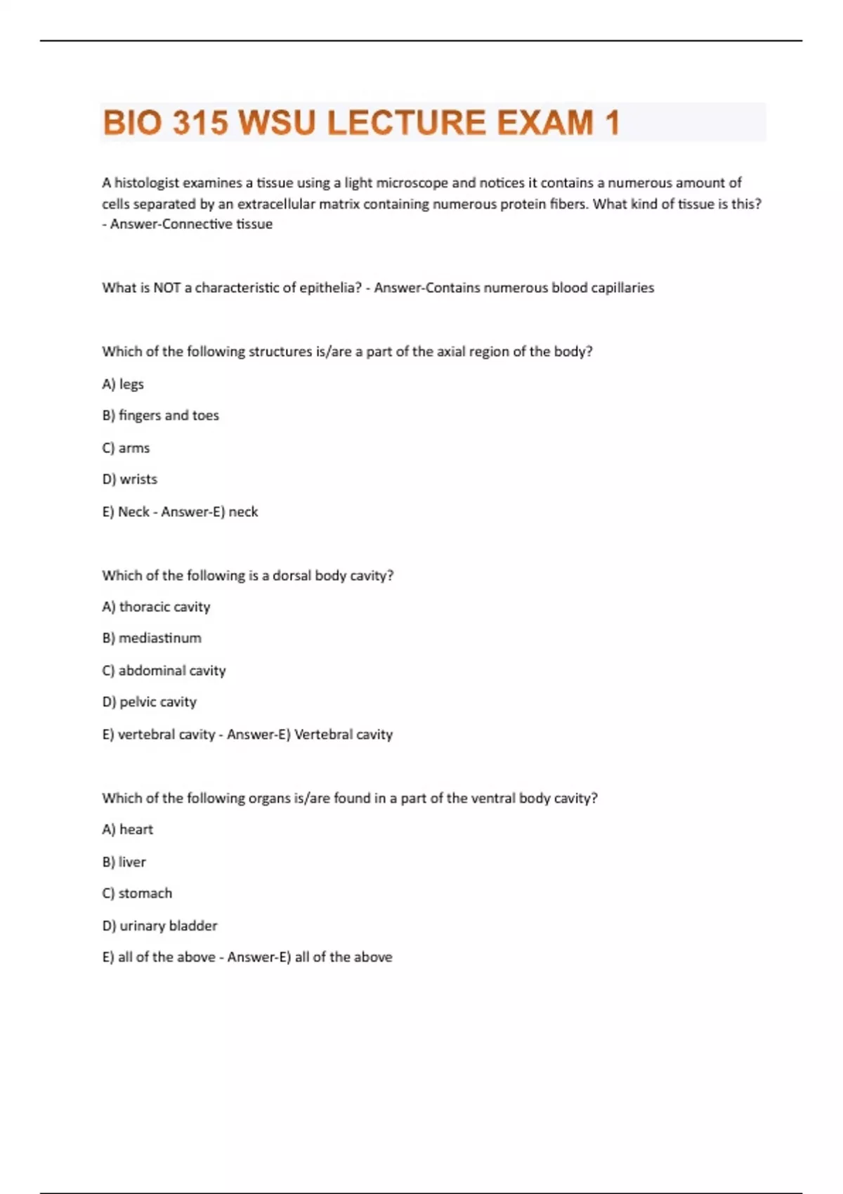 A histologist examines a tissue using a light microscope and notices it contains a numerous amount of cells separated by an extracellular matrix containing numerous protein fibers. What kind of tissue is this? - Answer-Connective tissue What is NOT a characteristic of epithelia? - Answer-Contains numerous blood capillaries Which of the following structures is/are a part of the axial region of the body? A) legs B) fingers and toes C) arms D) wrists E) Neck - Answer-E) neck Which of the following is a dorsal body cavity? A) thoracic cavity B) mediastinum C) abdominal cavity D) pelvic cavity E) vertebral cavity - Answer-E) Vertebral cavity Which of the following organs is/are found in a part of the ventral body cavity? A) heart B) liver C) stomach D) urinary bladder E) all of the above - Answer-E) all of the aboveWhich statement of the visceral serosa/pleura is FALSE? A) it clings tightly to the outer surface of visceral organs B) it is continuous with the parietal serosa C) it is deep to the parietal serosa D) it separates the internal from the external environment E) it secretes lubricating fluid - Answer-D) it separates the internal from the external environment A ____________ plane through the body divides it into anterior and posterior parts - Answer-Coronal plane The medical imaging technique that utilizes radioactive isotopes injected into the body to produce the image is called what? - Answer-Positron emission tomography (PET scan) The medical imaging technique that utilizes electromagnetic waves to produce a negative image of dense structures is called what? - Answer-X-ray The medical imaging technique that takes successive x-rays around a person's full circumference and is viewed in a transverse plane is called what? - Answer-Computed axial tomography (CAT scan)