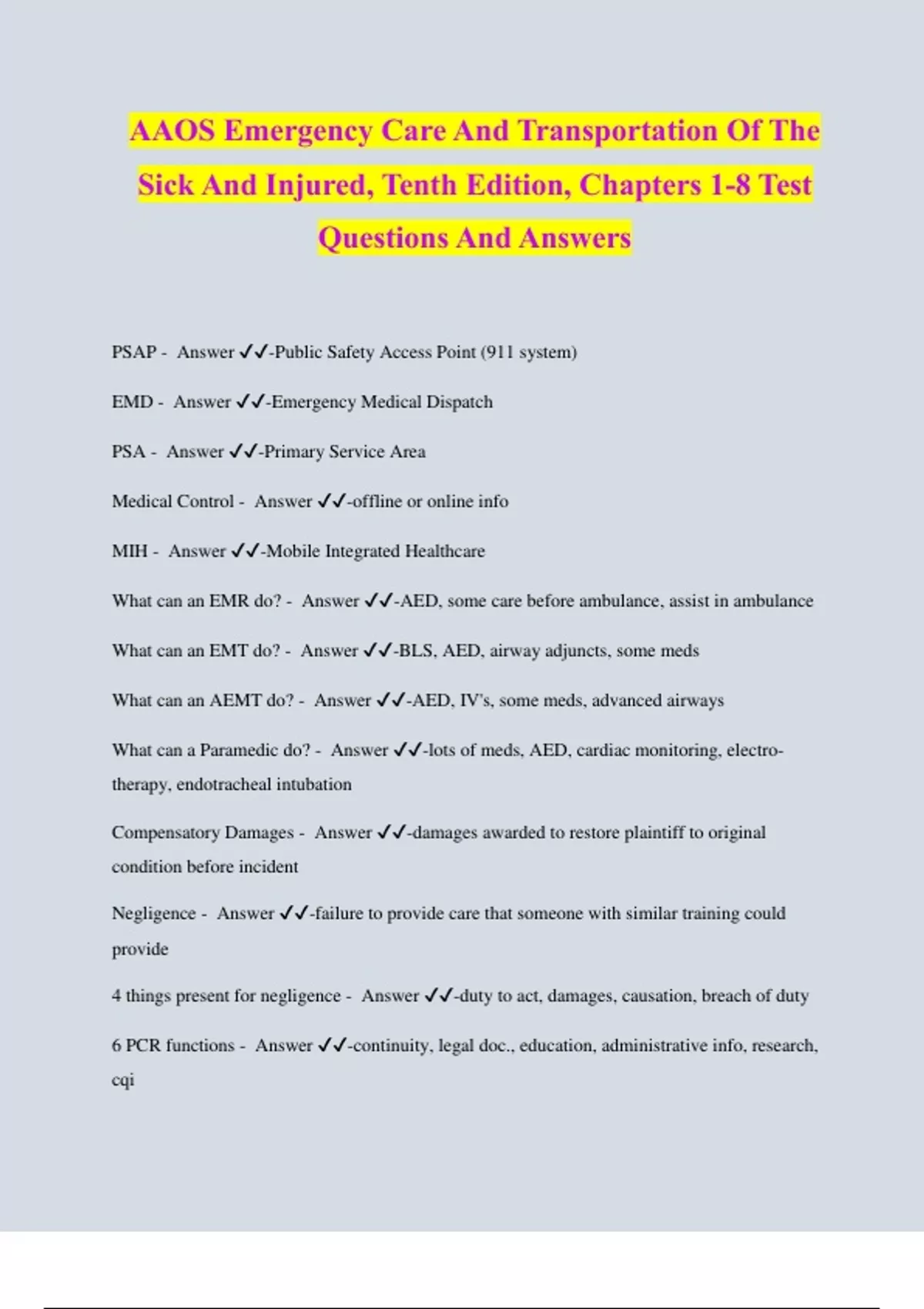 AAOS Emergency Care And Transportation Of The Sick And Injured, Tenth Edition, Chapters 1-8 Test Questions And Answers PSAP - Answer ️️ -Public Safety Access Point (911 system) EMD - Answer ️️ -Emergency Medical Dispatch PSA - Answer ️️ -Primary Service Area Medical Control - Answer ️️ -offline or online info MIH - Answer ️️ -Mobile Integrated Healthcare What can an EMR do? - Answer ️️ -AED, some care before ambulance, assist in ambulance What can an EMT do? - Answer ️️ -BLS, AED, airway adjuncts, some meds What can an AEMT do? - Answer ️️ -AED, IV's, some meds, advanced airways What can a Paramedic do? - Answer ️️ -lots of meds, AED, cardiac monitoring, electro- therapy, endotracheal intubation Compensatory Damages - Answer ️️ -damages awarded to restore plaintiff to original condition before incident Negligence - Answer ️️ -failure to provide care that someone with similar training could provide 4 things present for negligence - Answer ️️ -duty to act, damages, causation, breach of duty 6 PCR functions - Answer ️️ -continuity, legal doc., education, administrative info, research, cqi NEMSIS - Answer ️️ -collects all the EMS data AVPU - Answer ️️ -Awake and Alert, verbal responsive, pain responsive, unresponsive PPTE for A and O - Answer ️️ -Person, Place, Time, event ABoC - Answer ️️ -Airway Breathing Oxygen Circulation RRQ - Answer ️️ -rate rhythm quality O2 saturation normal amount - Answer ️️ -94-100 Capnography normal amount - Answer ️️ -30-45 mm Hg MSP - Answer ️️ -Major Bleed, Skin, Pulse Controls breathing - Answer ️️ -brain stem Controls ventilation cycles - Answer ️️ -medulla carotid = what area - Answer ️️ -neck sympathetic nervous system - Answer ️️ -speed up; fi