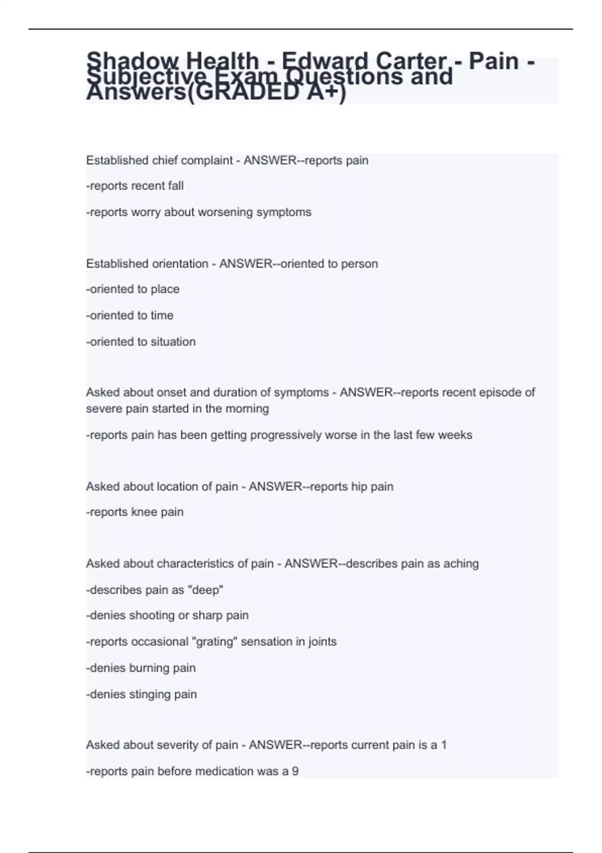 Shadow Health - Edward Carter - Pain - Subjective Exam Questions and Answers(GRADED A+)