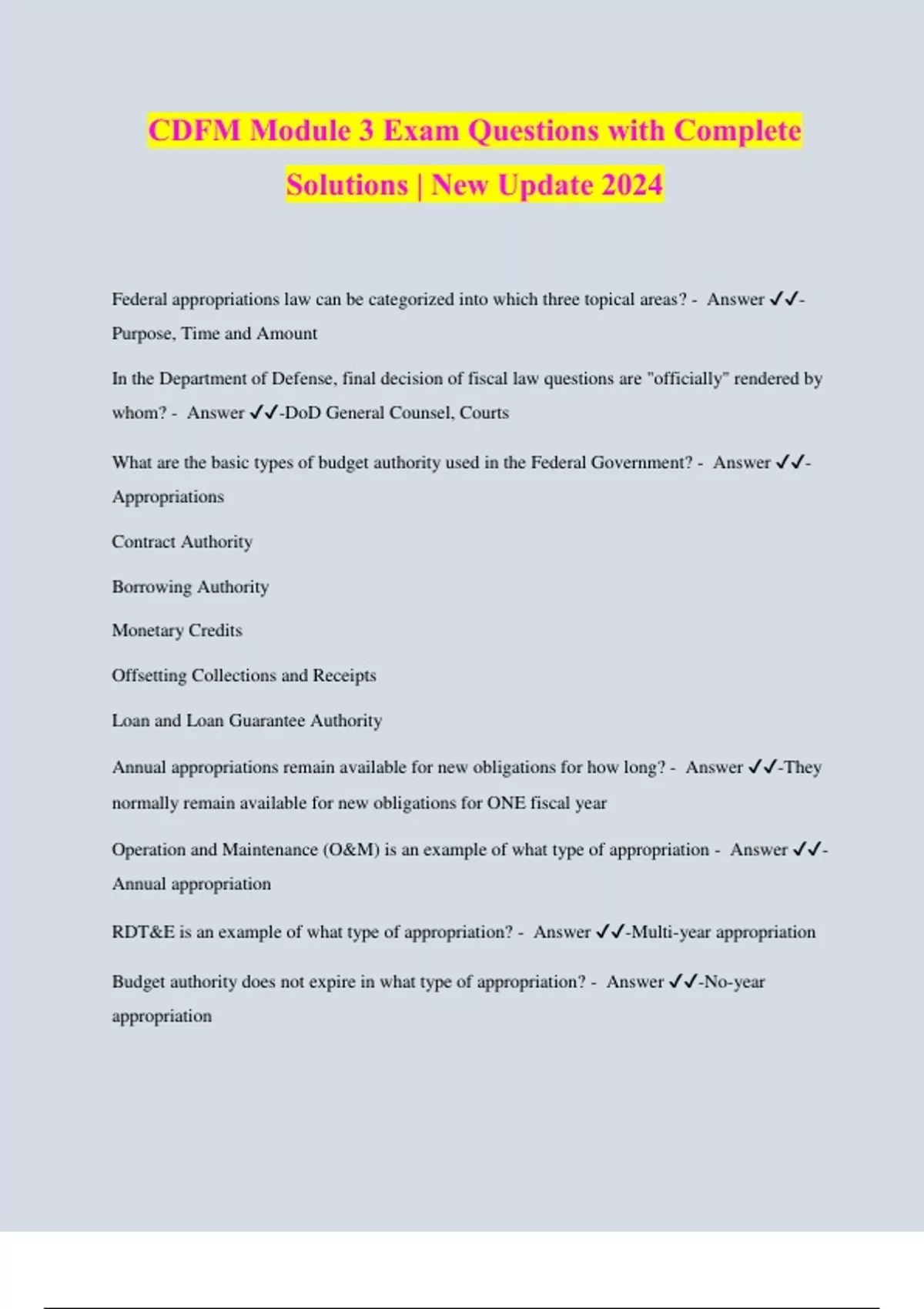 CDFM Module 3 Exam Questions with Complete Solutions | New Update 2024 Federal appropriations law can be categorized into which three topical areas? - Answer ️️ - Purpose, Time and Amount In the Department of Defense, final decision of fiscal law questions are "officially" rendered by whom? - Answer ️️ -DoD General Counsel, Courts What are the basic types of budget authority used in the Federal Government? - Answer ️️ - Appropriations Contract Authority Borrowing Authority Monetary Credits Offsetting Collections and Receipts Loan and Loan Guarantee Authority Annual appropriations remain available for new obligations for how long? - Answer ️️ -They normally remain available for new obligations for ONE fiscal year Operation and Maintenance (O&M) is an example of what type of appropriation - Answer ️️ - Annual appropriation RDT&E is an example of what type of appropriation? - Answer ️️ -Multi-year appropriation Budget authority does not expire in what type of appropriation? - Answer ️️ -No-year appropriation Article 1, Section 9, of the U.S. Constitution gives the power to appropriate funds for operating the Government to which branch of the Government? - Answer ️️ -Legislative Branch (Congress) Which law established the House and the Senate Budget Committees and the Congressional Budget Office (CBO)? - Answer ️️ -Congressional Budget Act of 1974 What are the three tests that must be met for use of Necessary Expense doctrine? - Answer ️️ - Must bear a logical relationship, not prohibited by law, not funded elsewhere Who are determined to be accountable individuals in the DoD? - Answer ️️ -Certifying and Disbursing Officers and Departmental Accountable Officials Who grants relief of liability to a certifying officer for erroneous or illegal payments in the Department of Defense? - Answer ️️ -DFAS What type of budgetary resources remain available for new obligations for more than one fiscal year? - Answer ️️ -Multi-year authority What type of budgetary resources remains available for new obligations until the purpose for which they were provided is carried out? - Answer ️️ -No-year authority What type of Congressional resolution can be thought of as a temporary appropriations act? - Answer ️️ -Continuing resolution If a Contracting Officers signs a contract in advance of an appropriation, what type of violation ahs occurred? - Answer ️️ -Anti Deficiency Act Violation What agency apportions funds for working capital fund? - Answer ️️ -OMB What are the four major functions in DoD Finance? - Answer ️️ -Entitlements, Payments, Collections, Control of Public Funds What is the primary organization in DoD with the responsibility for Finance requirements? - Answer ️️ -DFAS What is the acronym for disbursing office identification number? - Answer ️️ -DSSN What three primary types of officials are accountable Individuals in the DoD? - Answer ️️ - Certifying Officers, Disbursing Officers, Departmental Accountable Officials Debt collection incudes collection of debts from what three groups? - Answer ️️ -Current Employees and Military Members, Former Employees and Military Members, Vendors What is the normal collection method for debts owed by active military members and civilian employees who are still in service? - Answer ️️ -Salary Offset When collecting debts owed by vendors that have failed to properly respond to the demand letters, what is the next step? - Answer ️️ -Do Not Pay List When in doubt about the proper use of an appropriation, what may the disbursing officer request from the OSD General Counsel on the propriety of the prospective payment? - Answer ️️ -An advance decision To what, along with accountability, does certification equate? - Answer ️️ -Liability Who, besides the disbursing officer, is likely to be held accountable for an improper payment? - Answer ️️ -The Certifying Officer If a civilian employee receives less than 90% of his or her normal biweekly pay and allowances, what may he or she request? - Answer ️️ -Special Pay When a civilian employee moves from a job overseas to a job in the states, which organization pays for the Permanent Duty Travel? - Answer ️️ -The "losing" activity (the OCONUS activity) Name the supporting documents required in the DoD Payment Package. - Answer ️️ -Contract Invoice Proof of Receipt Acceptance Document Name two key forms that provide accountability and control by Disbursing Officers - Answer ️️ -Standard Form 1219 Statement of Accountabil
