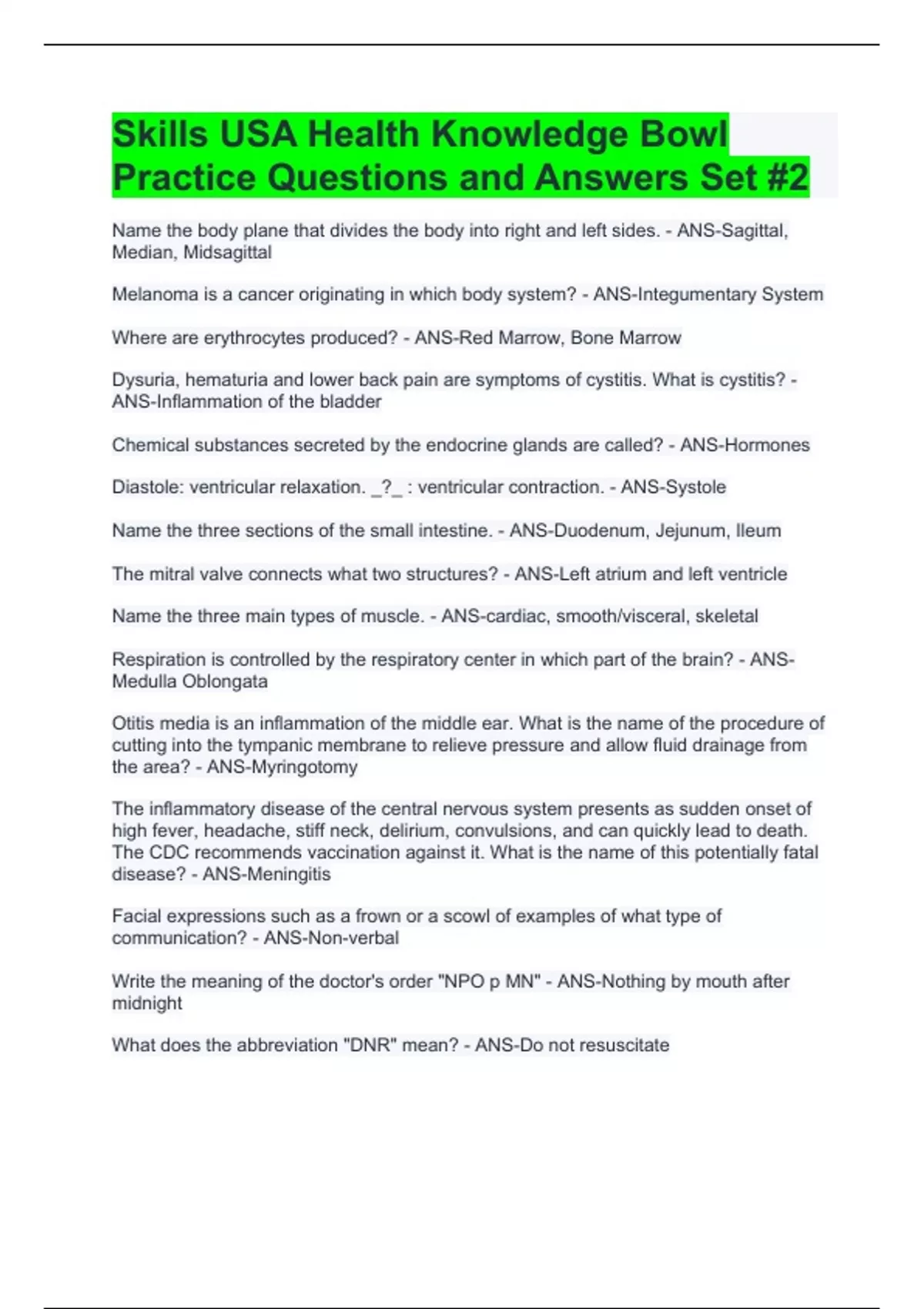 Skills USA Health Knowledge Bowl Practice Questions and Answers Set #2