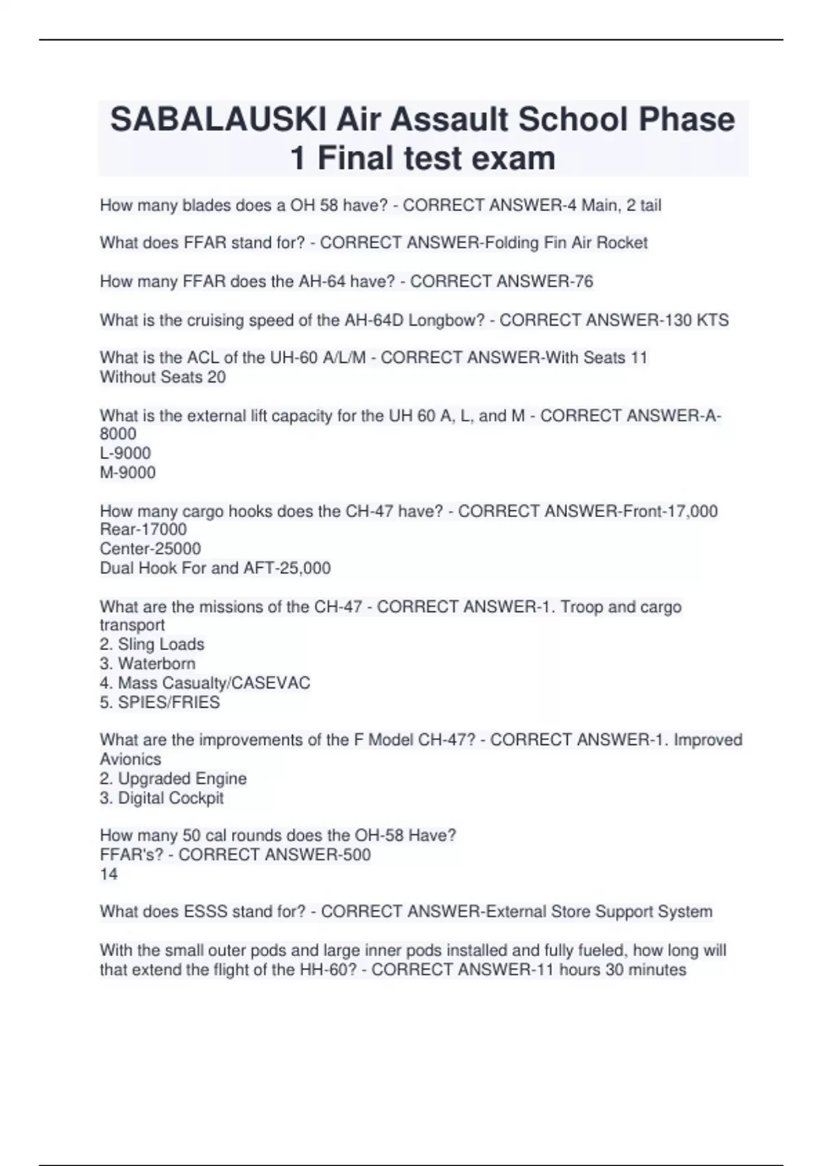 SABALAUSKI Air Assault School Phase 1 Final test exam How many blades does a OH 58 have? - CORRECT ANSWER-4 Main, 2 tail What does FFAR stand for? - CORRECT ANSWER-Folding Fin Air Rocket How many FFAR does the AH-64 have? - CORRECT ANSWER-76 What is the cruising speed of the AH-64D Longbow? - CORRECT ANSWER-130 KTS What is the ACL of the UH-60 A/L/M - CORRECT ANSWER-With Seats 11 Without Seats 20 What is the external lift capacity for the UH 60 A, L, and M - CORRECT ANSWER-A8000 L-9000 M-9000 How many cargo hooks does the CH-47 have? - CORRECT ANSWER-Front-17,000 Rear-17000 Center-25000 Dual Hook For and AFT-25,000 What are the missions of the CH-47 - CORRECT ANSWER-1. Troop and cargo transport 2. Sling Loads 3. Waterborn 4. Mass Casualty/CASEVAC 5. SPIES/FRIES What are the improvements of the F Model CH-47? - CORRECT ANSWER-1. Improved Avionics 2. Upgraded Engine 3. Digital Cockpit How many 50 cal rounds does the OH-58 Have? FFAR's? - CORRECT ANSWER-500 14 What does ESSS stand for? - CORRECT ANSWER-External Store Support System With the small outer pods and large inner pods installed and fully fueled, how long will that extend the flight of the HH-60? - CORRECT ANSWER-11 hours 30 minutes How long will the large inner 450 gallon pods extend the flight time? - CORRECT ANSWER-3 hours How long will the small outer 230 gallon pods extend the flight time? - CORRECT ANSWER-60-90 minutes What is the crew for tactical operations for the CH 47? - CORRECT ANSWER-4-1 pilot, 1 CP, 1 CE and 1 flight eng