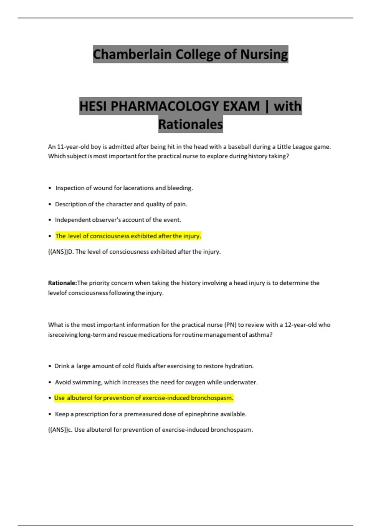 Chamberlain College of Nursing HESI PHARMACOLOGY EXAM | with Rationales