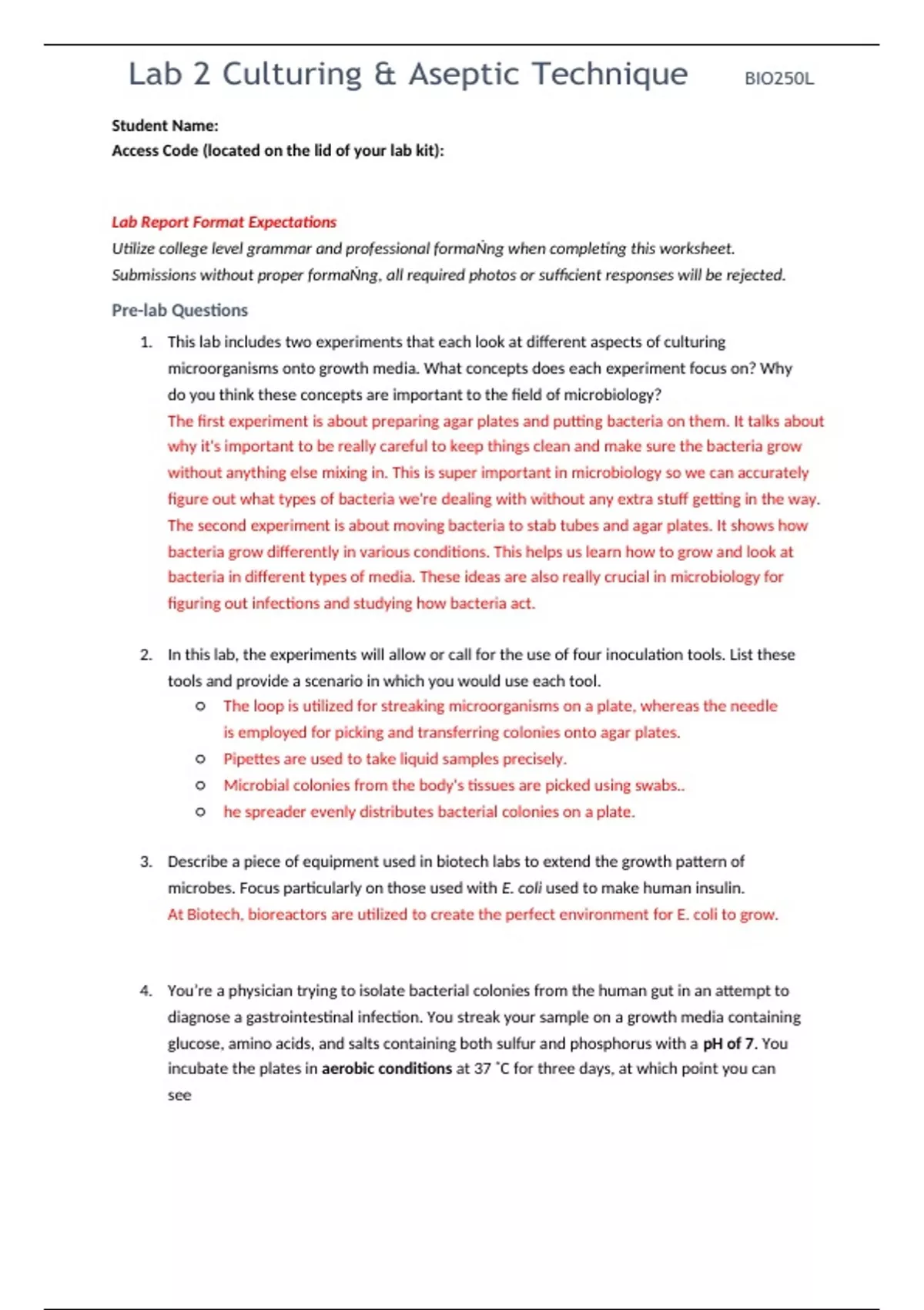 Lab Report Format Expectations Utilize college level grammar and professional formatting when completing this worksheet. Submissions without proper formatting, all required photos or sufficient responses will be rejected. Pre-lab Questions 1. This lab includes two experiments that each look at different aspects of culturing microorganisms onto growth media. What concepts does each experiment focus on? Why do you think these concepts are important to the field of microbiology? The first experiment is about preparing agar plates and putting bacteria on them. It talks about why it's important to be really careful to keep things clean and make sure the bacteria grow without anything else mixing in. This is super important in microbiology so we can accurately figure out what types of bacteria we're dealing with without any extra stuff getting in the way. The second experiment is about moving bacteria to stab tubes and agar plates. It shows how bacteria grow differently in various conditions. This helps us learn how to grow and look at bacteria in different types of media. These ideas are also really crucial in microbiology for figuring out infections and studying how bacteria act. 2. In this lab, the experiments will allow or call for the use of four inoculation tools. List these tools and provide a scenario in which you would use each tool. ○ The loop is utilized for streaking microorganisms on a plate, whereas the needle is employed for picking and transferring colonies onto agar plates. ○ Pipettes are used to take liquid samples precisely. ○ Microbial colonies from the body's tissues are picked using swabs.. ○ he spreader evenly distributes bacterial colonies on a plate. 3. Describe a piece of equipment used in biotech labs to extend the growth pattern of microbes. Focus particularly on those used with E. coli used to make human insulin. At Biotech, bioreactors are utilized to create the perfect environment for E. coli to grow. 4. You’re a physician trying to isolate bacterial colonies from the human gut in an attempt to diagnose a gastrointestinal infection. You streak your sample on a growth media containing glucose, amino acids, and salts containing both sulfur and phosphorus with a pH of 7. You incubate the plates in aerobic conditions at 37 ˚C for three days, at which point you can see