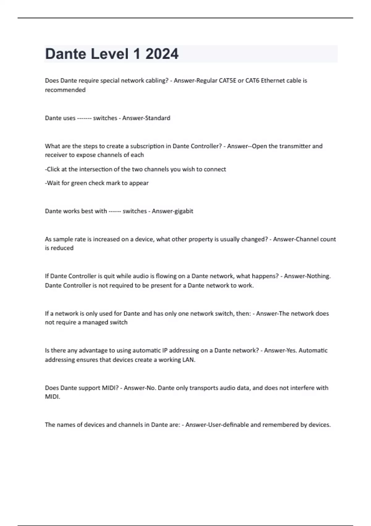 Does Dante require special network cabling? - Answer-Regular CAT5E or CAT6 Ethernet cable is recommended Dante uses ------- switches - Answer-Standard What are the steps to create a subscription in Dante Controller? - Answer--Open the transmitter and receiver to expose channels of each -Click at the intersection of the two channels you wish to connect -Wait for green check mark to appear Dante works best with ------ switches - Answer-gigabit As sample rate is increased on a device, what other property is usually changed? - Answer-Channel count is reduced If Dante Controller is quit while audio is flowing on a Dante network, what happens? - Answer-Nothing. Dante Controller is not required to be present for a Dante network to work. If a network is only used for Dante and has only one network switch, then: - Answer-The network does not require a managed switch Is there any advantage to using automatic IP addressing on a Dante network? - Answer-Yes. Automatic addressing ensures that devices create a working LAN. Does Dante support MIDI? - Answer-No. Dante only transports audio data, and does not interfere with MIDI. The names of devices and channels in Dante are: - Answer-User-definable and remembered by devices.The sample rate of an audio system dictates: - Answer-The highest audio frequency that the system can handle The bit depth of an audio system dictates: - Answer-The amplitude resolution of each sample What is meant by a "stand alone" Dante network? - Answer-One that is not connected to the internet or to other networks A ----- network topology is the best practice for dante - Answer-Star Dante use fiber instead of copper cable for Ethernet. - Answer-Can How are devices added to a Dante network? - Answer-Devices are automatically discovered and displayed in Dante Controller How are devices restored to a Dante network after power cycle? - Answer-How are devices restored to a Dante network after power cycle? Dante is an example of - Answer-an audio over IP (AoIP) solution On a Dante network, latency is: - Answer-deterministic, set per device The default Dante latency of 1 millisecond is: - Answer-very low and suitable for the majority of applications A gigabit connection can handle ----- channels of Dante audio at 48kHz sample rate and 24-bit depth. - Answer-512x512 A connection between Dante audio channels is called: - Answer-a subscription