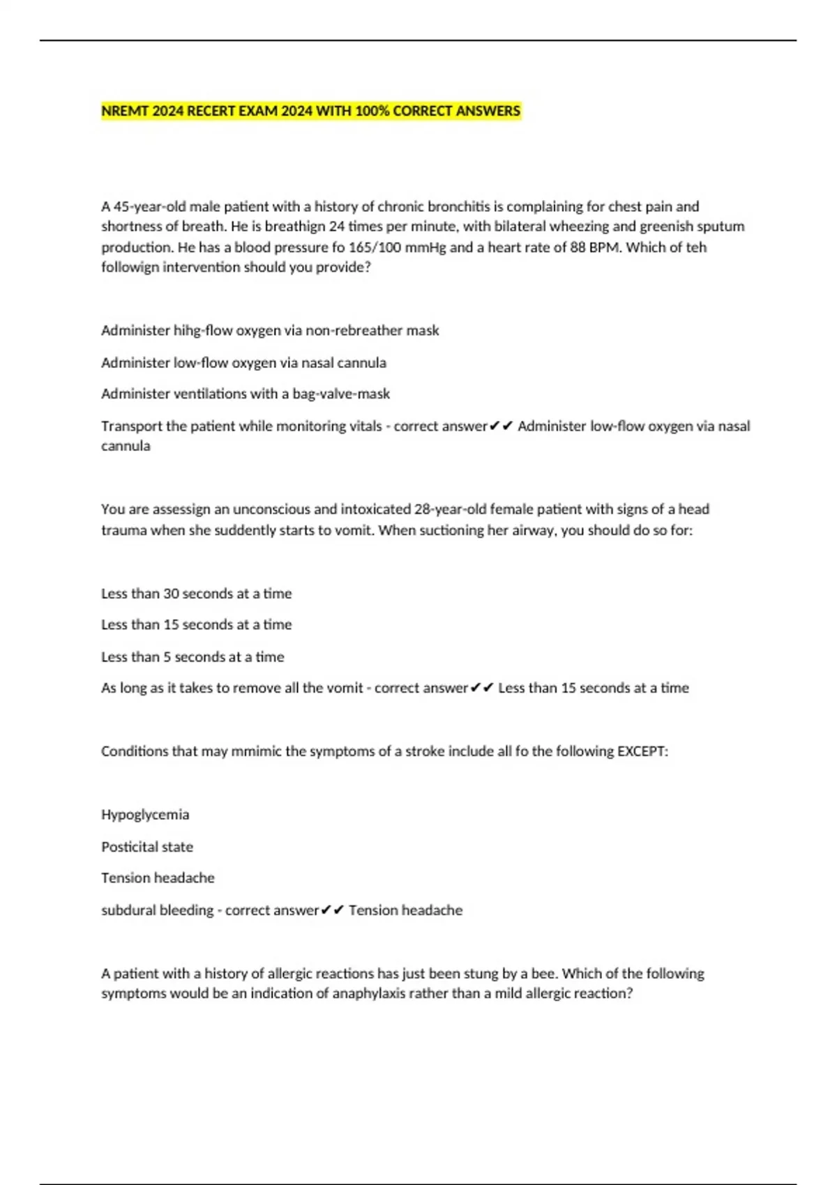NREMT 2024 RECERT EXAM 2024 WITH 100% CORRECT ANSWERS A 45-year-old male patient with a history of chronic bronchitis is complaining for chest pain and shortness of breath. He is breathign 24 times per minute, with bilateral wheezing and greenish sputum production. He has a blood pressure fo 165/100 mmHg and a heart rate of 88 BPM. Which of teh followign intervention should you provide? Administer hihg-flow oxygen via non-rebreather mask Administer low-flow oxygen via nasal cannula Administer ventilations with a bag-valve-mask Transport the patient while monitoring vitals - correct answer Administer low-flow oxygen via nasal cannula You are assessign an unconscious and intoxicated 28-year-old female patient with signs of a head trauma when she suddently starts to vomit. When suctioning her airway, you should do so for: Less than 30 seconds at a time Less than 15 seconds at a time Less than 5 seconds at a time As long as it takes to remove all the vomit - correct answer Less than 15 seconds at a time Conditions that may mmimic the symptoms of a stroke include all fo the following EXCEPT: Hypoglycemia Posticital state Tension headache subdural bleeding - correct answer Tension headache