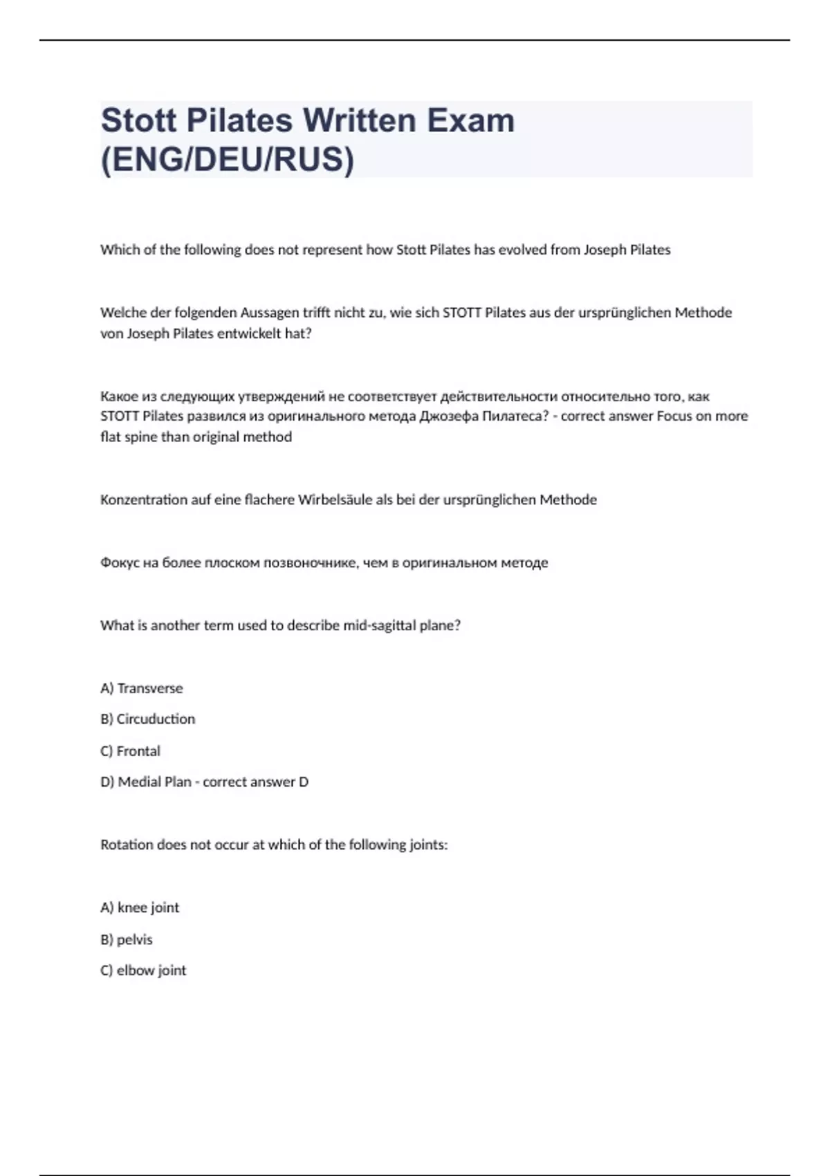 Stott Pilates Written Exam (ENG DEU RUS) questions with completed solutions 2024