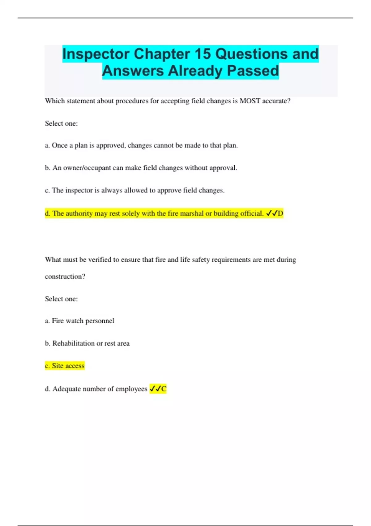 Inspector Chapter 15 Questions and Answers Already Passed Which statement about procedures for accepting field changes is MOST accurate? Select one: a. Once a plan is approved, changes cannot be made to that plan. b. An owner/occupant can make field changes without approval. c. The inspector is always allowed to approve field changes. d. The authority may rest solely with the fire marshal or building official. D What must be verified to ensure that fire and life safety requirements are met during construction? Select one: a. Fire watch personnel b. Rehabilitation or rest area c. Site access d. Adequate number of employees C Which of the following helps prevent firefighters and emergency responders from dealing with unknown and potentially dangerous structural conditions? Select one: a. Building permits b. Limiting response to known conditions c. Interviewing victims at the scene d. Interviewing bystanders at the scene A Which statement about inspector site visits during construction is MOST accurate? Select one: a. Unless there is a problem, an inspector does not need to visit the site. b. An inspector should visit the site often. c. Site visits are determined by the owner/occupant. d. An inspector should visit the site at the start and end of the project. B Which of the following makes inspector site visits more efficient and effective? Select one: a. Coordinating inspections when contractors are unaware of dates b. Coordinating inspections with completion dates c. Coordinating inspections with employee work times d. Coordinating inspections with other duties in the area B Conducting plans review enables plans examiners to: Select one: a. determine appropriate fees. b. discover any errors or omissions in a building plan. c. determine insurance rates. d. discover demographic information about occupants. B On construction drawings, abbreviations and symbols are widely used and plans reviewers: Select one: a. do not need to be familiar with abbreviations and symbols as these are not standard. b. should be familiar with some of the more commonly used abbreviations and symbols. c. should be familiar with all abbreviations and symbols used. d. often need the assistance of a design professional to decipher the abbreviations and symbols. B The inspector or plans examiner who reviews the plans: Select one: a. must have another inspector or plans