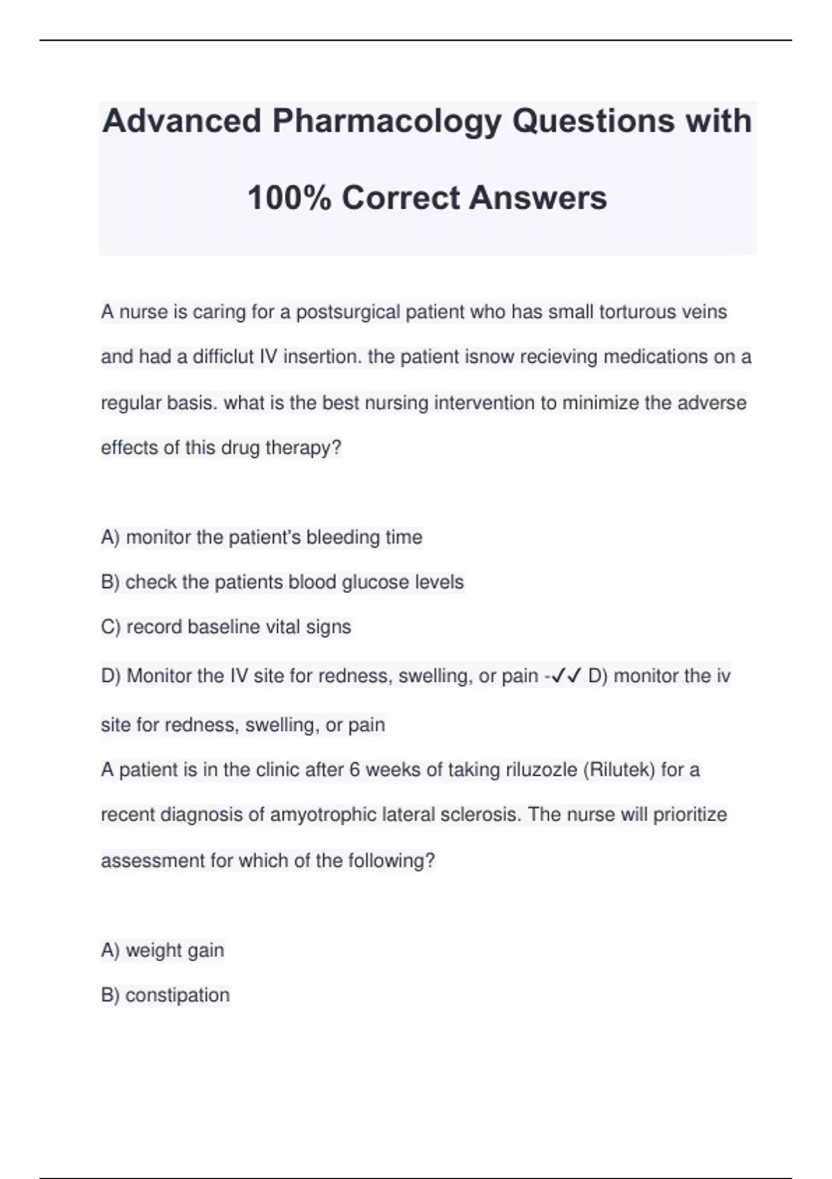 Advanced Pharmacology Questions with 100% Correct Answers A nurse is caring for a postsurgical patient who has small torturous veins and had a difficlut IV insertion. the patient isnow recieving medications on a regular basis. what is the best nursing intervention to minimize the adverse effects of this drug therapy? A) monitor the patient's bleeding time B) check the patients blood glucose levels C) record baseline vital signs D) Monitor the IV site for redness, swelling, or pain - D) monitor the iv site for redness, swelling, or pain A patient is in the clinic after 6 weeks of taking riluzozle (Rilutek) for a recent diagnosis of amyotrophic lateral sclerosis. The nurse will prioritize assessment for which of the following? A) weight gain B) constipation C) increased energy D) dizziness - D) dizziness Which of the following patients demonstrates the clearest indication for treatment with prednisone?