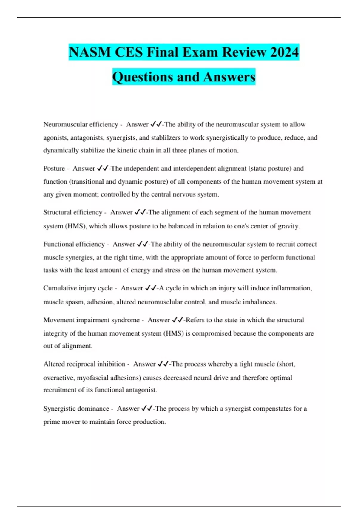 NASM CES Final Exam Review 2024 Questions and Answers Neuromuscular efficiency - Answer ️️ -The ability of the neuromuscular system to allow agonists, antagonists, synergists, and stablilzers to work synergistically to produce, reduce, and dynamically stabilize the kinetic chain in all three planes of motion. Posture - Answer ️️ -The independent and interdependent alignment (static posture) and function (transitional and dynamic posture) of all components of the human movement system at any given moment; controlled by the central nervous system. Structural efficiency - Answer ️️ -The alignment of each segment of the human movement system (HMS), which allows posture to be balanced in relation to one's center of gravity. Functional efficiency - Answer ️️ -The ability of the neuromuscular system to recruit correct muscle synergies, at the right time, with the appropriate amount of force to perform functional tasks with the least amount of energy and stress on the human movement system. Cumulative injury cycle - Answer ️️ -A cycle in which an injury will induce inflammation, muscle spasm, adhesion, altered neuromusclular control, and muscle imbalances. Movement impairment syndrome - Answer ️️ -Refers to the state in which the structural integrity of the human movement system (HMS) is compromised because the components are out of alignment. Altered reciprocal inhibition - Answer ️️ -The process whereby a tight muscle (short, overactive, myofascial adhesions) causes decreased neural drive and therefore optimal recruitment of its functional antagonist. Synergistic dominance - Answer ️️ -The process by which a synergist compenstates for a prime mover to maintain force production. Lower extremity movement impairment syndrome - Answer ️️ -Usually characterized by excessive foot pronation (flat feet), increased knee valgus (tibia externally rotated and femur internally rotated and adducted or knock-kneed), and increased movement at the lumbo-pelvic- hip-complex (extension or flexion) during functional movements. Upper extremity movement impairment syndrome - Answer ️️ -Usually characterized as having rounded shoulders and a forward head posture or improper scapulothoracic or glenohumeral kinematics during functional movements. Lengthening Techniques - Answer ️️ -2nd phase in the Corrective Exercise Continuum is to lengthen those overactive or tight neuromyofascial tissues. Lengthening - Answer ️️ -refers to the elongation of mechanically shortened muscle and connective tissuenecessary to increase range of motion (ROM) at the tissue and joint. 2 most common methods of stretching: - Answer ️️ -Static stretching Neuromuscular stretching Static stretching - Answer ️️ -Combines low force with long duration using autogenic inhibition. This form of stretching allows for relaxation and concomitant elongation of muscle. To perform static stretching, the stretch is held at the first point of tension or resistance barrier for 30 seconds. Performed solo Neuromuscular stretching - Answer ️️ -commonly called proprioceptive neuromuscular facilitation,or PNF involves taking the muscle to its end ROM (point of joint compensation), actively contracting the muscle to be stretched for 7 -15 seconds, then passively moving the joint to a new end ROM and holding this position for 20-30 seconds. Recurrent inhibition - Answer ️️ -A feedback circuit that can decrease the excitability of motor neurons via the interneuron called the Renshaw cell. Stretch reflex - Answer ️️ -A muscle contraction in response to stretching within the muscle. Static stretching is characterized by: - Answer ️️ -The elongation of neuromyofascial tissue to an end-range and statically holding that position fora period of time. Maximal control of structural alignment Minimal acceleration into and out of the elongated (stretch) position. Neuromuscular stretching is (NMS) characterized by: - Answer ️️ -Taking the muscle to its end ROM (point of joint compensation) Active contraction of the muscle to be stretched Passively (or actively) moving to a new end ROM Statically holding new position for 20-30 seconds and repeating 3 times. Neuromuscular stretching - Answer ️️ -Is a technique that involves a process of isometrically contracting a desired muscle in a lengthened position to induce a relazation response on the tissue, allowing it to further elongate. Requires the assistance of another person. Autogenic inhibition - Answer ️️ -The process when neural impulses that sense tension are greater than the impulses that cause muscles to contract, pro