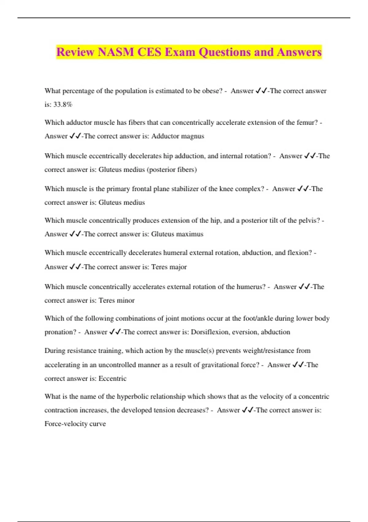 Review NASM CES Exam Questions and Answers What percentage of the population is estimated to be obese? - Answer ️️ -The correct answer is: 33.8% Which adductor muscle has fibers that can concentrically accelerate extension of the femur? - Answer ️️ -The correct answer is: Adductor magnus Which muscle eccentrically decelerates hip adduction, and internal rotation? - Answer ️️ -The correct answer is: Gluteus medius (posterior fibers) Which muscle is the primary frontal plane stabilizer of the knee complex? - Answer ️️ -The correct answer is: Gluteus medius Which muscle concentrically produces extension of the hip, and a posterior tilt of the pelvis? - Answer ️️ -The correct answer is: Gluteus maximus Which muscle eccentrically decelerates humeral external rotation, abduction, and flexion? - Answer ️️ -The correct answer is: Teres major Which muscle concentrically accelerates external rotation of the humerus? - Answer ️️ -The correct answer is: Teres minor Which of the following combinations of joint motions occur at the foot/ankle during lower body pronation? - Answer ️️ -The correct answer is: Dorsiflexion, eversion, abduction During resistance training, which action by the muscle(s) prevents weight/resistance from accelerating in an uncontrolled manner as a result of gravitational force? - Answer ️️ -The correct answer is: Eccentric What is the name of the hyperbolic relationship which shows that as the velocity of a concentric contraction increases, the developed tension decreases? - Answer ️️ -The correct answer is: Force-velocity curve Which subsystem consists of force-couple relationships that primarily control the pelvis and femur in the frontal plane during single-leg functional movements such as gait, lunges, or stair climbing? - Answer ️️ -The correct answer is: Lateral subsystem More than one third of all work-related injuries involve the trunk, and of these, - Answer ️️ - The correct answer is: more than 60% involve the low back. What system is predominantly responsible for movement and consists of more superficial musculature that originates from the pelvis to the rib cage, the lower extremities, or both? - Answer ️️ -The correct answer is: Global muscular system According to the textbook, what is defined as the interaction between two entities or bodies that results in either acceleration or deceleration of an object? - Answer ️️ -The correct answer is: Force The gluteus medius, tensor fascia latae, adductor complex, and quadratus lumborum comprise the - Answer ️️ -The correct answer is: lateral subsystem. What system is responsible for the joint support system of the lumbo-pelvic-hip-complex (LPHC) and consists of muscles that originate and/or insert into the lumbar spine? - Answer ️️ -The correct answer is: Local musculature system Individuals with the lower extremity movement impairment syndrome are usually characterized as having - Answer ️️ -The correct answer is: knee valgus A client demonstrates rounded shoulder posture and later indicates that he has suffered from shoulder pain in the past. Which of the following patterns of dysfunction are most likely present? - Answer ️️ -The correct answer is: Lengthened rhomboids and shortened anterior deltiod It is determined that a client demonstrates an upper extremity movement impairment syndrome. Which of the following muscles are most likely tight? - Answer ️️ -The correct answer is: Upper trapezius, levator scapula It is determined that a client demonstrates lower extremity movement impairment syndrome. Which of the following musculature is most likely tight? - Answer ️️ -The correct answer is: Erector spinae, lateral hamstrings Individuals with the upper-extremity movement impairment syndrome are usually characterized as having - Answer ️️ -The correct answer is: rounded shoulders and forward head. A client has been a waitress for many years, forced to carry heavy tr