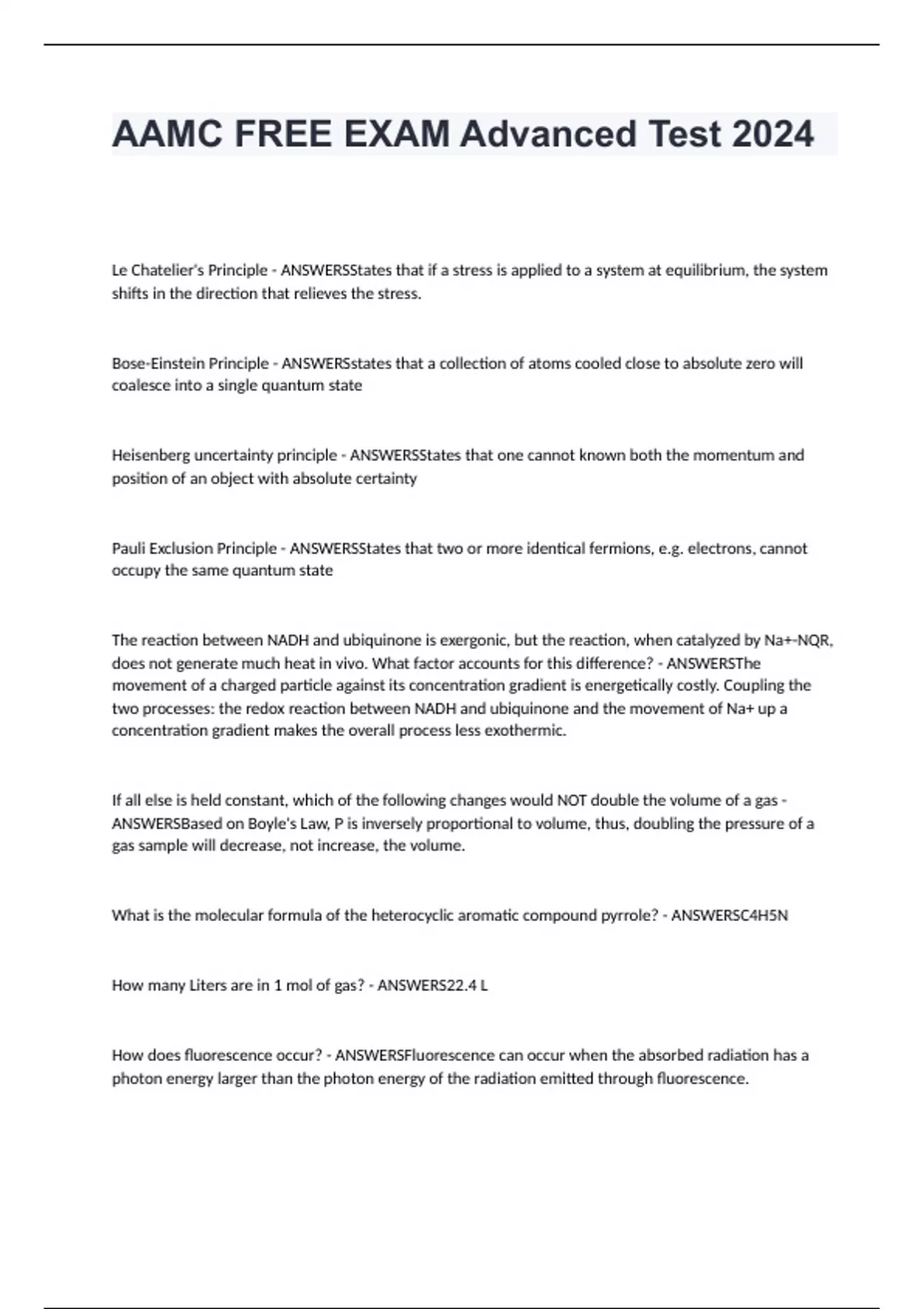 Le Chatelier's Principle - ANSWERSStates that if a stress is applied to a system at equilibrium, the system shifts in the direction that relieves the stress. Bose-Einstein Principle - ANSWERSstates that a collection of atoms cooled close to absolute zero will coalesce into a single quantum state Heisenberg uncertainty principle - ANSWERSStates that one cannot known both the momentum and position of an object with absolute certainty Pauli Exclusion Principle - ANSWERSStates that two or more identical fermions, e.g. electrons, cannot occupy the same quantum state The reaction between NADH and ubiquinone is exergonic, but the reaction, when catalyzed by Na+-NQR, does not generate much heat in vivo. What factor accounts for this difference? - ANSWERSThe movement of a charged particle against its concentration gradient is energetically costly. Coupling the two processes: the redox reaction between NADH and ubiquinone and the movement of Na+ up a concentration gradient makes the overall process less exothermic. If all else is held constant, which of the following changes would NOT double the volume of a gas - ANSWERSBased on Boyle's Law, P is inversely proportional to volume, thus, doubling the pressure of a gas sample will decrease, not increase, the volume. What is the molecular formula of the heterocyclic aromatic compound pyrrole? - ANSWERSC4H5N How many Liters are in 1 mol of gas? - ANSWERS22.4 L How does fluorescence occur? - ANSWERSFluorescence can occur when the absorbed radiation has a photon energy larger than the photon energy of the radiation emitted through fluorescence. A major obstacle to obtaining useful energy from a nuclear fusion reactor is containment of the fuel at the very high temperatures required for fusion. The reason such high temperatures are required is to: - ANSWERSenable reactants to approach within range of the strong nuclear force. Enantiomers can exhibit a difference in which chemical or physical property - ANSWERSEnantiomers have the same physical and chemical properties. They differ only in their three dimensional arrangement of atoms and their interactions with other chiral molecules. They can differ in their smell due to interacting differently with chiral odorant receptors. Blood Flow Speed - ANSWERSV= Q/A A= Pi*r^2 Which of the following species has an electron configuration equivalent to that of a noble gas A. Ca2+ B. Cu2+ C.O D.H - ANSWERSCa2+ has lost its valence electrons and thus attains the electronic configuration of the previous noble gas (Ar). Copper has 11 outer electrons. Loss of 2 electrons. positive cooperativity - ANSWERSthe first substrate changes the shape of the enzyme allowing other substrates to bind more easily A 2 kg mass and a 5 kg mass are connected by a massless cord suspended over a massless and frictionless pulley. If the acceleration due to gravity is g, what will be the acceleration of the masses after they are released from rest? - ANSWERSAccording to Newton's second law, the net force acting on the 5-kg mass is given by the expression Fnet= 5 kg × a1 = 5 kg × g - T, where a1 is the acceleration after the release and T is the tension in the cord. The net force acting on the 2-kg mass is given by the expression Fnet= 2 kg × a2 = 2 kg × g - T. Because the two masses move simultaneously but in opposite directions after they are released, a1 = -a2 = a. Substituting the expression T = 5 kg × (g - a) into the equation of motion of the 2-kg mass yields -2 kg × a = 2 kg × g - 5 kg × (g - a) = -3 kg × g + 5 kg × a. Then 7 kg × a = 3 kg × g, hence a = 3g/7. An ice cube at 0°C and 1 atm is heated to form steam at 100°C and 1 atm. Ignoring heat loss to the surroundings, what part of the process uses the most heat? (Note: Specific heat of water = 1 cal/g°C. Heat of fusion = 80 cal/g. Heat of vaporization = 540 cal/g.) - ANSWERSVaporizing all the water requires 540 cal/g, which is a greater heat requirement than specific heat or heat of fusion. Based on the passage, which of the following is closest to the pressure exerted on the chest by a 10 × 5 cm rectangular paddle during defibrillation? (Note: 1 Pa = 1 N/m2.) - ANSWERSPressure is the ratio of the force applied perpendicular to a surface and the area of the surface. Because the normal component of the force is 100 N and the area is 10 cm × 5 cm = 50 cm2 = 0.005 m2, the pressure is (100 N)/(0.005 m2) = 20 kPa Capacitance has a parallel relationship to... - ANSWERS1. Area of the parallel plates 2. Permittivity 3. Volage Capacitance has an inverse relationship to... - ANSWERSSeparation between the parallel plates If the wavelength of a light beam were doubled, its frequency would be: - ANSWERSThe product between wavelength and frequency is constant when light travels through a certain medium, thus doubling the wavelength results in halving the frequency. If the energy of a photon is doubled, which of the following properties of the photon will also double? - ANSWERSThe energy of a photon is given by the relationship E = hf. If E is doubled, then frequency f is doubled, too, as Planck's constant h does not change. If the red line in the Balmer series has a wavelength of 656 nm, which of the following is closest to its frequency? - ANSWERSFor light that travels in vacuum, wavelength and frequency are related according to wavelength × frequency = 3.0 × 108 m/s. Solving for frequency yields (3.0 × 108 m/s)/(656 × 10-9 m) = 4.6 × 1014 Hz. Which of the following is closest to the wavelength of a photon whose energy is 2 eV? - ANSWERSUsing hc = 4.1 × 10-15 eV•s × 3 × 108 m/s = 1230 eV•nm, and λ = hc/E, then E = 2 eV corresponds to λ = (1230 eV•nm)/(2 eV) = 615 nm, which is closest to 620 nm. adaptive immunity - ANSWERSthe ability to recognize and remember specific antigens and mount an attack on them e.x., T and B cells Which metabolic process are GI tract bacteria directly involved? - ANSWERSConversion of PS into short chain fatty acids Which amino acid exhibits
